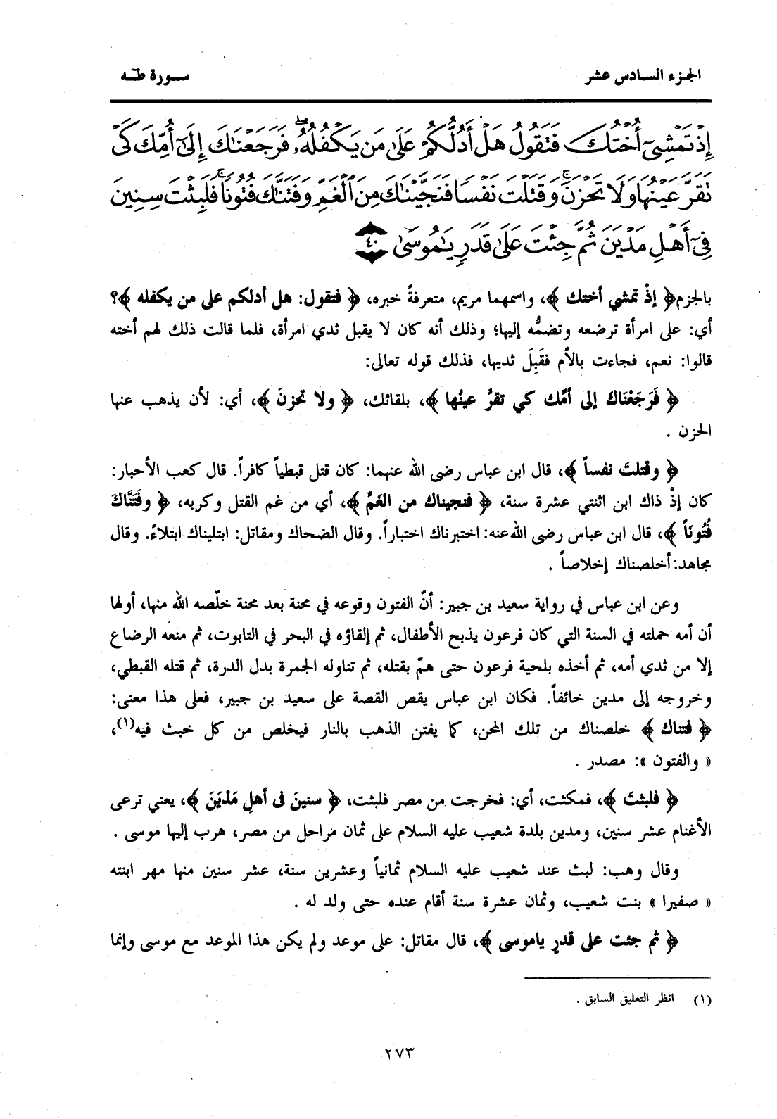 {إِذْ تَمْشِي أُخْتُكَ فَتَقُولُ هَلْ أَدُلُّكُمْ عَلَى مَنْ يَكْفُلُهُ فَرَجَعْنَاكَ إِلَى أُمِّكَ كَيْ تَقَرَّ عَيْنُهَا وَلَا تَحْزَنَ وَقَتَلْتَ نَفْسًا فَنَجَّيْنَاكَ مِنَ الْغَمِّ وَفَتَنَّاكَ فُتُونًا فَلَبِثْتَ سِنِينَ فِي أَهْلِ مَدْيَنَ ثُمَّ جِئْتَ عَلَى قَدَرٍ يَا مُوسَى (40) }