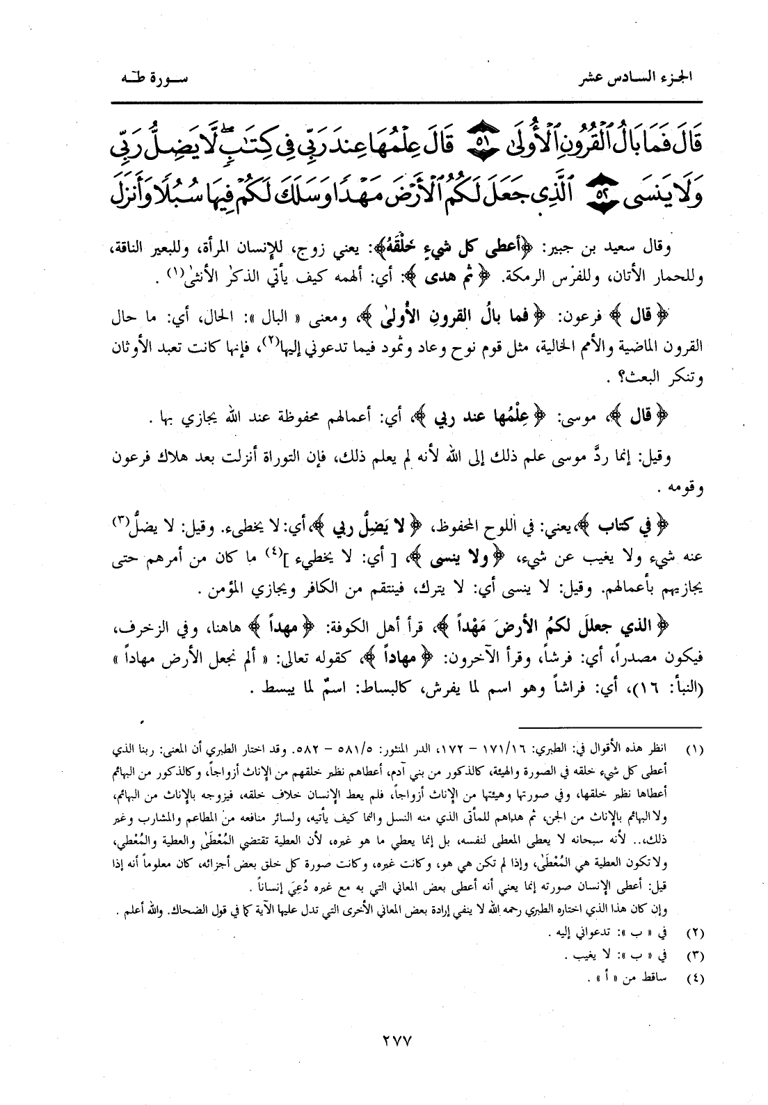 {فِي كِتَابٍ} يَعْنِي: فِي اللَّوْحِ الْمَحْفُوظِ، {لَا يَضِلُّ رَبِّي} أَيْ: لَا +يُخْطِئُ. وَقِيلَ: لَا يَضِلُّ (2) عَنْهُ شَيْءٌ وَلَا يَغِيبُ عَنْ شَيْءٍ، {وَلَا يَنْسَى} [أي: لا يخطيء] (3) مَا كَانَ مِنْ أَمْرِهِمْ حَتَّى يُجَازِيَهُمْ بِأَعْمَالِهِمْ. وَقِيلَ: لَا يَنْسَى أَيْ: لَا يَتْرُكُ، فَيَنْتَقِمُ مِنَ الْكَافِرِ وَيُجَازِي الْمُؤْمِنَ. {الَّذِي جَعَلَ لَكُمُ الْأَرْضَ مَهْدًا} قَرَأَ أَهْلُ الْكُوفَةِ: {مَهْدًا} هَا هُنَا، وَفِي الزُّخْرُفِ، فَيَكُونُ مَصْدَرًا، أَيْ: فَرْشًا، وَقَرَأَ الْآخَرُونَ: "مِهَادًا "، كَقَوْلِهِ تَعَالَى: "أَلَمْ نَجْعَلِ الْأَرْضَ مِهَادًا" (النَّبإِ: 16) ، أَيْ: فِرَاشًا وَهُوَ اسْمٌ لِمَا يُفْرَشُ، كَالْبِسَاطِ: اسْمٌ لِمَا يُبْسَطُ.
