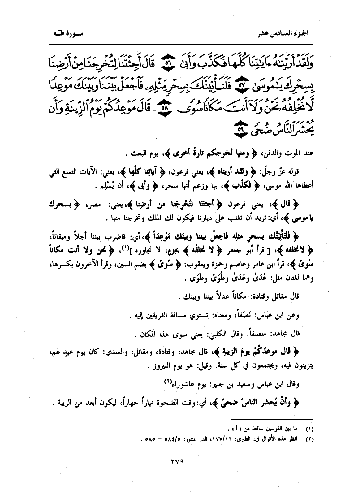 قَالَ مُجَاهِدٌ: مُنْصِفًا. وَقَالَ الْكَلْبِيُّ: يَعْنِي سِوَى هَذَا الْمَكَانِ. {قَالَ مَوْعِدُكُمْ يَوْمُ الزِّينَةِ} قَالَ مُجَاهِدٌ، وَقَتَادَةُ، وَمُقَاتِلٌ، وَالسُّدِّيُّ: كَانَ يَوْمَ عِيدٍ لَهُمْ، يَتَزَيَّنُونَ فِيهِ، وَيَجْتَمِعُونَ فِي كُلِّ سَنَةٍ. وَقِيلَ: هُوَ يَوْمُ النَّيْرُوزِ.