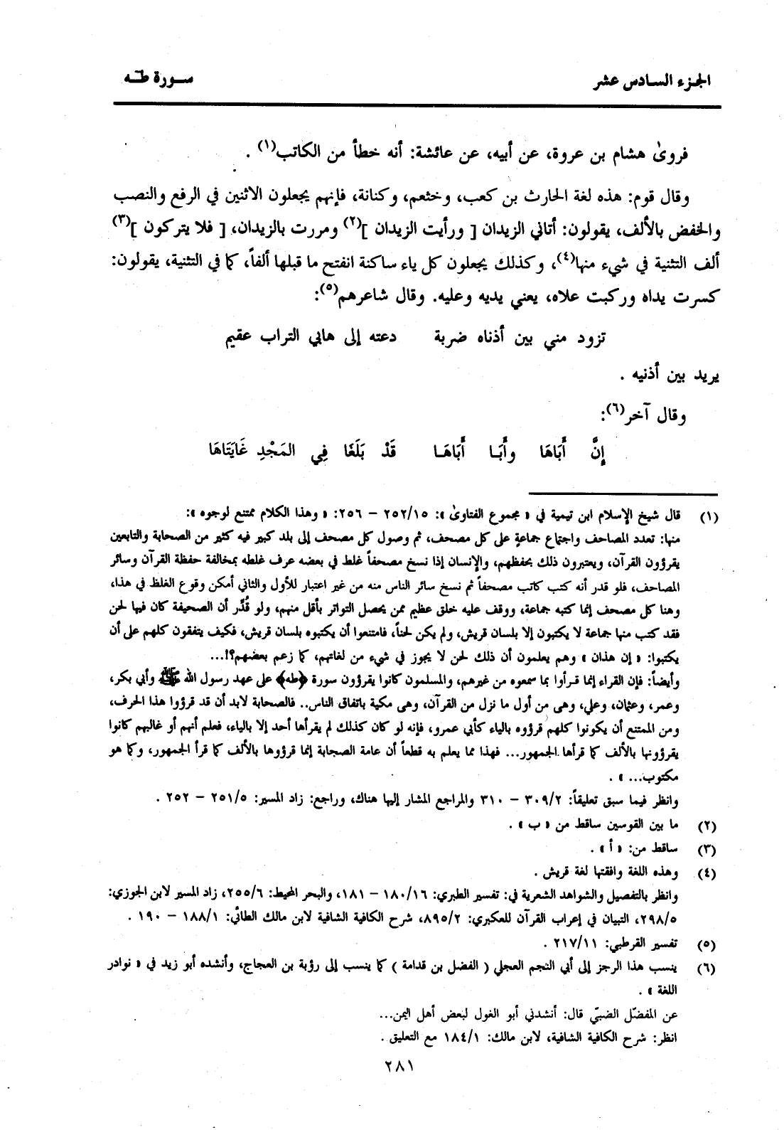 (1) قال شيخ الإسلام ابن تيمية في "مجموع الفتاوى": 15 / 252 - 256: " وهذا الكلام ممتنع لوجوه: منها: تعدد المصاحف واجتماع جماعة على كل مصحف، ثم وصول كل مصحف إلى بلد كبير فيه كثير من الصحابة والتابعين +يقرءون القرآن، ويعتبرون ذلك بحفظهم، والإنسان إذا نسخ مصحفا غلط في بعضه عرف غلطه بمخالفة حفظة القرآن وسائر المصاحف، فلو قدر أنه كتب كاتب مصحفا ثم نسخ سائر الناس منه من غير اعتبار للأول والثاني أمكن وقوع +الغلظ في هذا، وهنا كل مصحف إنما كتبه جماعة، ووقف عليه خلق عظيم ممن يحصل التواتر بأقل منهم، ولو قدر أن الصحيفة كان فيها لحن فقد كتب منها جماعة لا يكتبون إلا بلسان قريش، ولم يكن لحنا، فامتنعوا أن يكتبوه بلسان قريش، فكيف يتفقون كلهم على أن يكتبوا: "إن هذان" وهم يعلمون أن ذلك لحن لا يجوز في شيء من لغاتهم، كما زعم بعضهم؟! ... وأيضا: فإن القراء إنما قرأوا بما سمعوه من غيرهم، والمسلمون كانوا +يقرءون سورة "طه" على عهد رسول الله صَلَّى اللَّهُ عَلَيْهِ وَسَلَّمَ وأبي بكر، وعمر، وعثمان، وعلي، وهي من أول ما نزل من القرآن، وهي مكية باتفاق الناس. . فالصحابة لابد أن +قرءوا هذا الحرف، ومن الممتنع أن يكونوا كلهم +قرءوه بالياء كأبي عمرو، فإنه لو كان كذلك لم يقرأها أحد إلا بالياء فعلم أنهم أو غالبهم كانوا +يقرءونها بالألف كما قرأها الجمهور. . . فهذا مما يعلم به قطعا أن عامة الصحابة إنما +قرءوها بالألف كما قرأ الجمهور، وكما هو مكتوب. . . ". وانظر فيما سبق تعليقا: 2 / 309 - 310 والمراجع المشار إليها هناك، وراجع: زاد المسير: 5 / 251 - 252.