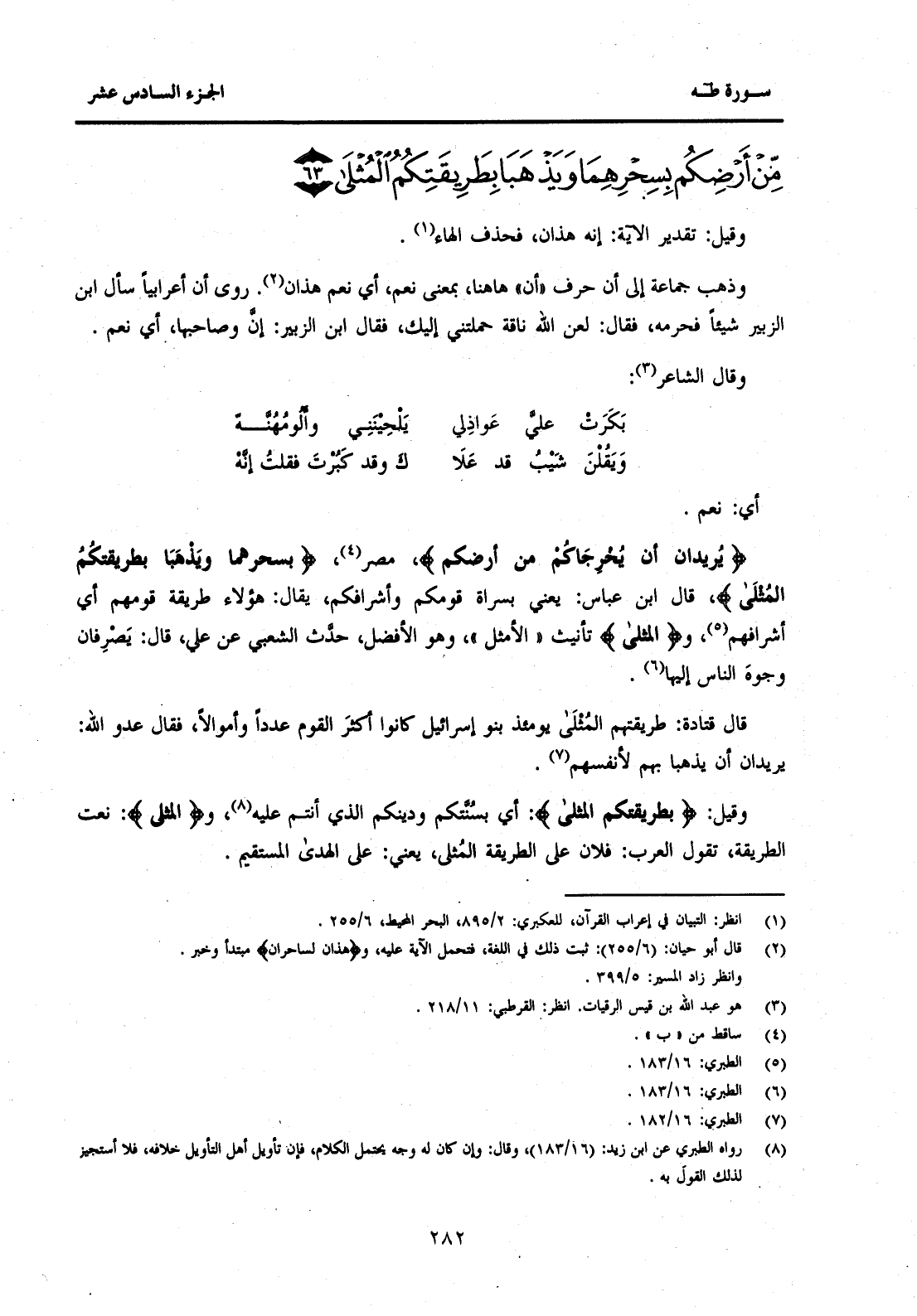 وَقِيلَ: {بِطَرِيقَتِكُمُ الْمُثْلَى} أَيْ بِسُنَّتِكُمْ وَدِينِكُمُ الَّذِي أَنْتُمْ عَلَيْهِ (8) وَ {الْمُثْلَى} نَعْتُ الطَّرِيقَةِ، تَقُولُ الْعَرَبُ: فُلَانٌ عَلَى الطَّرِيقَةِ الْمُثْلَى، يَعْنِي: عَلَى الْهُدَى الْمُسْتَقِيمِ.
