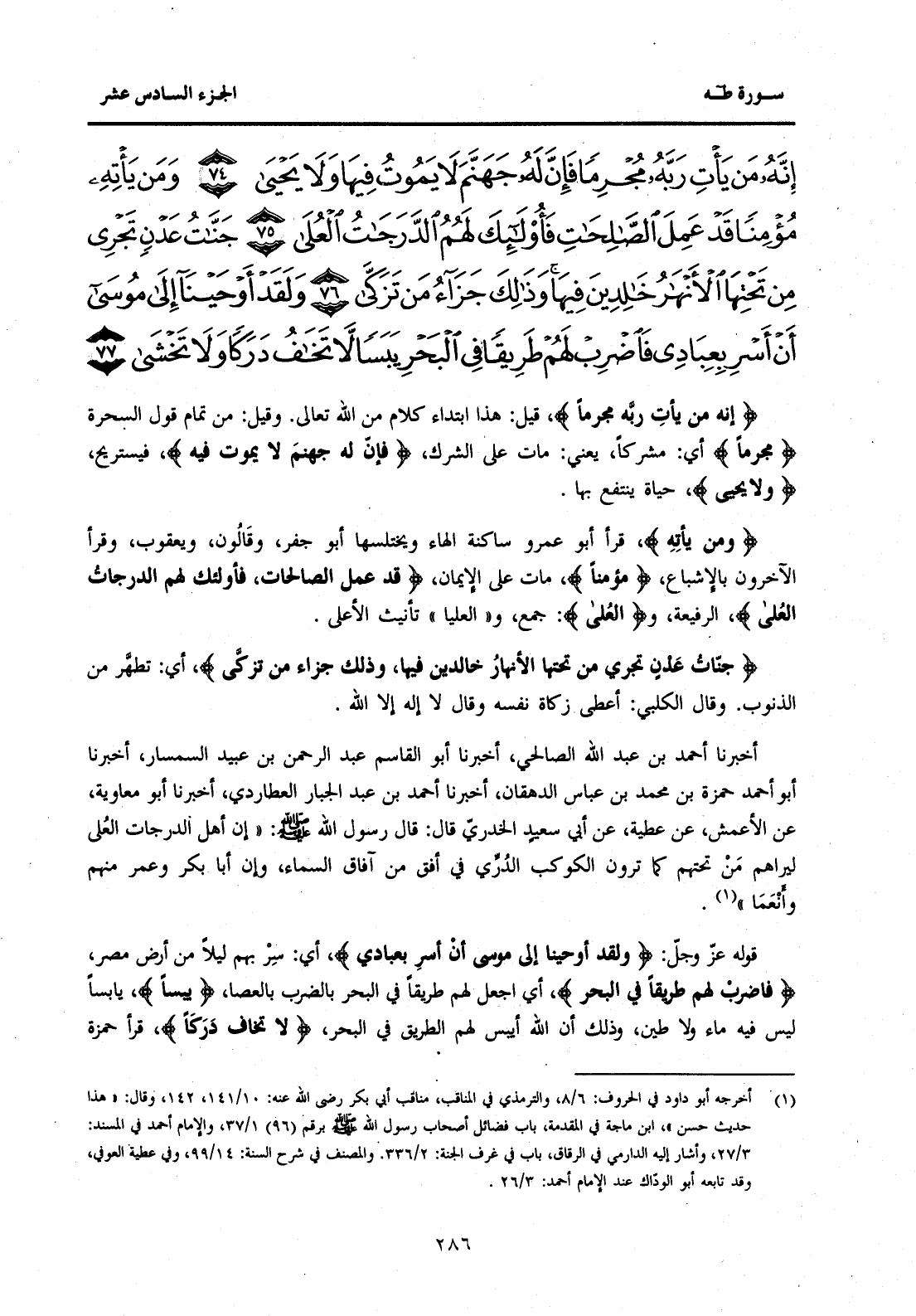 أَخْبَرَنَا أَحْمَدُ بْنُ عَبْدِ اللَّهِ الصَّالِحِيُّ، أَخْبَرَنَا أَبُو الْقَاسِمِ عَبْدُ الرَّحْمَنِ بْنُ عُبَيْدٍ السِّمْسَارُ، أَخْبَرَنَا أَبُو أَحْمَدَ حَمْزَةُ بْنُ مُحَمَّدِ بْنِ عَبَّاسٍ الدِّهْقَانُ، أَخْبَرَنَا أَحْمَدُ بْنُ عَبْدِ الْجَبَّارِ العُطَارِدِيُّ، أَخْبَرَنَا أَبُو مُعَاوِيَةَ، عَنِ الْأَعْمَشِ، عَنْ عَطِيَّةَ، عَنْ أَبِي سَعِيدٍ الْخُدْرِيِّ قَالَ: قَالَ رَسُولُ اللَّهِ صَلَّى اللَّهُ عَلَيْهِ وَسَلَّمَ: "إِنَّ أَهْلَ الدَّرَجَاتِ الْعُلَى لَيَرَاهُمْ مَنْ تَحْتَهُمْ كَمَا تَرَوْنَ الْكَوْكَبَ الدُّرِّيَّ فِي أُفُقٍ مِنْ آفَاقِ السَّمَاءِ، وَإِنَّ أَبَا بَكْرٍ وَعُمَرَ مِنْهُمْ وَأَنْعَمَا" (1) قَوْلُهُ عَزَّ وَجَلَّ: {وَلَقَدْ أَوْحَيْنَا إِلَى مُوسَى أَنْ أَسْرِ بِعِبَادِي} أَيْ: سِرْ بِهِمْ لَيْلًا مِنْ أَرْضِ مِصْرَ، {فَاضْرِبْ لَهُمْ طَرِيقًا فِي الْبَحْرِ} أَيِ اجْعَلْ لَهُمْ طَرِيقًا فِي الْبَحْرِ بِالضَّرْبِ بِالْعَصَا، {يَبَسًا} يَابِسًا لَيْسَ فِيهِ مَاءٌ وَلَا طِينٌ، وَذَلِكَ أَنَّ اللَّهَ أَيْبَسَ لَهُمُ الطَّرِيقَ فِي الْبَحْرِ، {لَا تَخَافُ دَرَكًا} قَرَأَ حَمْزَةُ