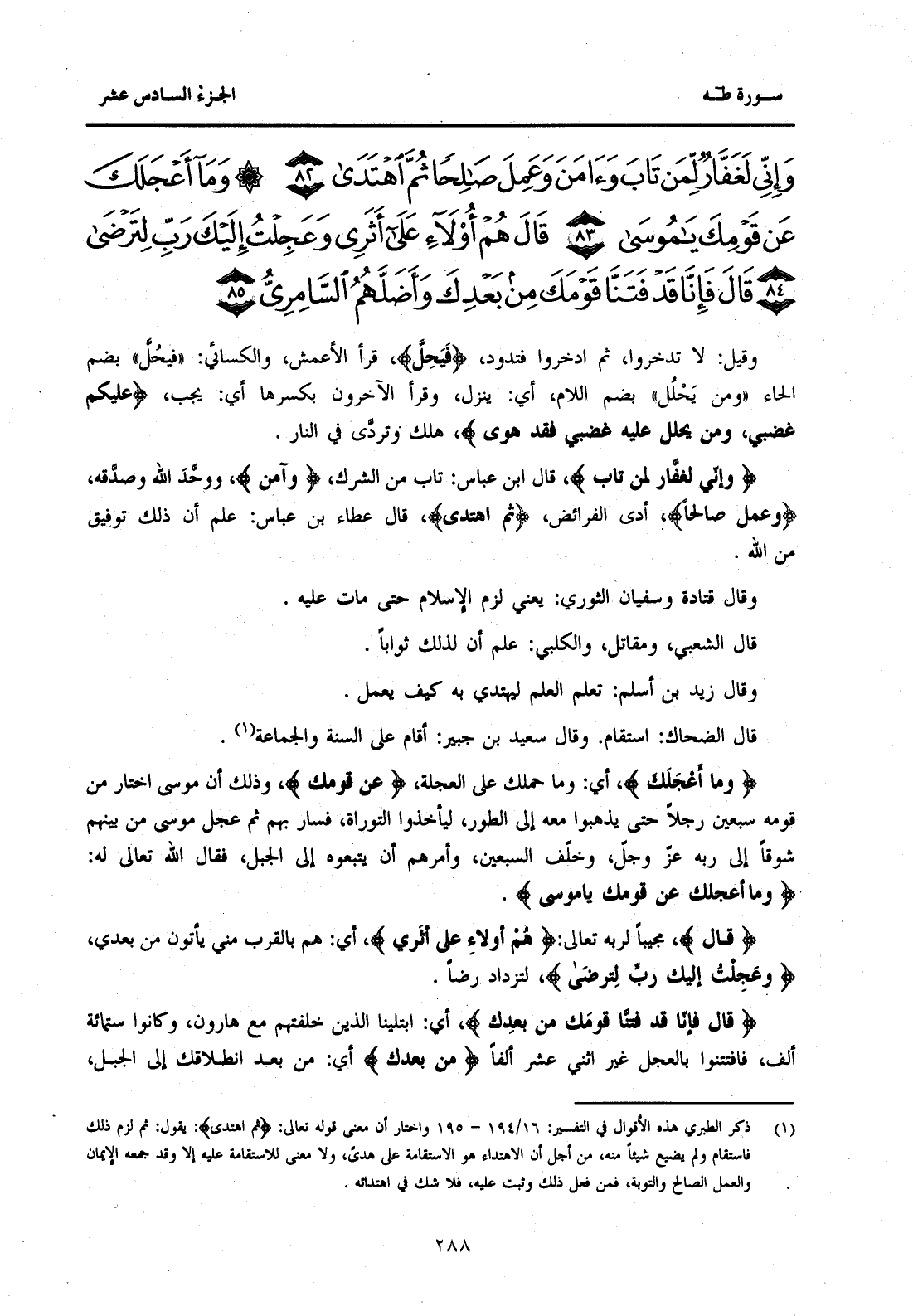 (1) ذكر الطبري هذه الأقوال في التفسير: 16 / 194 - 195 واختار أن معنى قوله تعالى: "ثم اهتدى": يقول: ثم لزم ذلك فاستقام ولم يصنع شيئا منه، من أجل أن الاهتداء هو الاستقامة على هدى، ولا معنى للاستقامة عليه إلا وقد جمعه الإيمان والعمل الصالح والتوبة، فمن فعل ذلك وثبت عليه، فلا شك في اهتدائه.