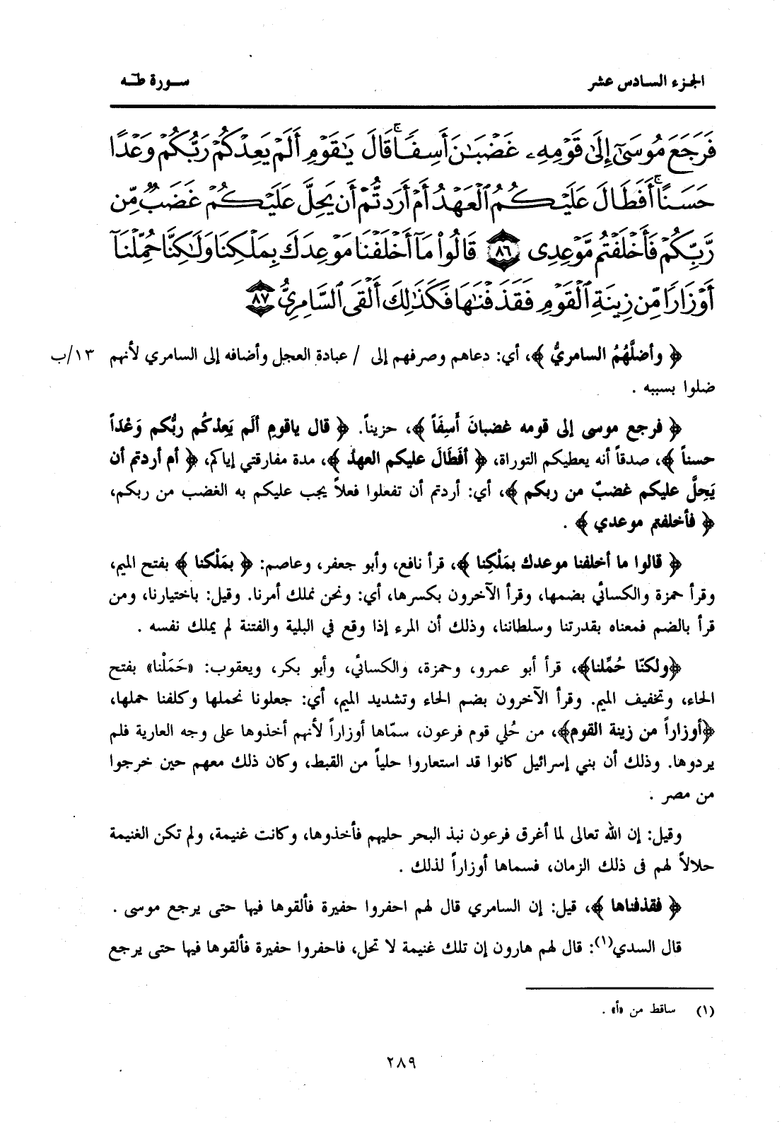 {فَرَجَعَ مُوسَى إِلَى قَوْمِهِ غَضْبَانَ أَسِفًا قَالَ يَا قَوْمِ أَلَمْ يَعِدْكُمْ رَبُّكُمْ وَعْدًا حَسَنًا أَفَطَالَ عَلَيْكُمُ الْعَهْدُ أَمْ أَرَدْتُمْ أَنْ يَحِلَّ عَلَيْكُمْ غَضَبٌ مِنْ رَبِّكُمْ فَأَخْلَفْتُمْ مَوْعِدِي (86) قَالُوا مَا أَخْلَفْنَا مَوْعِدَكَ بِمَلْكِنَا وَلَكِنَّا حُمِّلْنَا أَوْزَارًا مِنْ زِينَةِ الْقَوْمِ فَقَذَفْنَاهَا فَكَذَلِكَ أَلْقَى السَّامِرِيُّ (87) }
