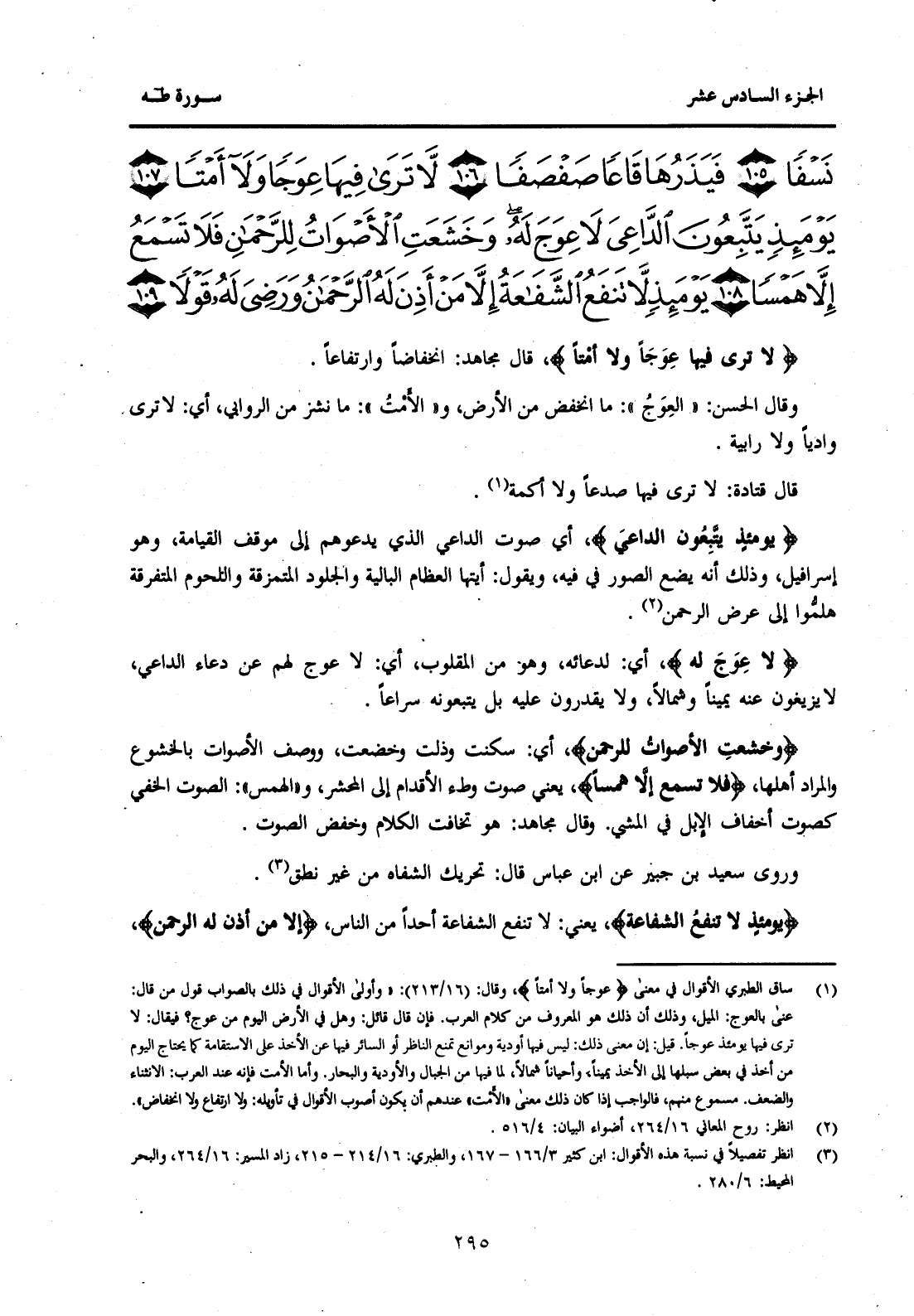(1) ساق الطبري الأقوال في معنى "عوجا ولا أمتا"، وقال: (16 / 213) : "وأولى الأقوال في ذلك بالصواب قول من قال: عني بالعوج: الميل، وذلك أن ذلك هو المعروف من كلام العرب. فإن قال قائل: وهل في الأرض اليوم من عوج؟ فيقال: لا ترى فيها يومئذ عوجا. قيل: إن معنى ذلك: ليس فيها أودية وموانع تمنع الناظر أو السائر فيها عن الأخذ على الاستقامة كما يحتاج اليوم من أخذ في بعض سبلها إلى الأخذ يمينا، وأحيانا شمالا، لما فيها من الجبال والأودية والبحار. وأما الأمت فإنه عند العرب: الانثناء والضعف. مسموع منهم، فالواجب إذا كان ذلك معنى "الأمت" عندهم أن يكون أصوب الأقوال في تأويله: ولا ارتفاع ولا انخفاض".