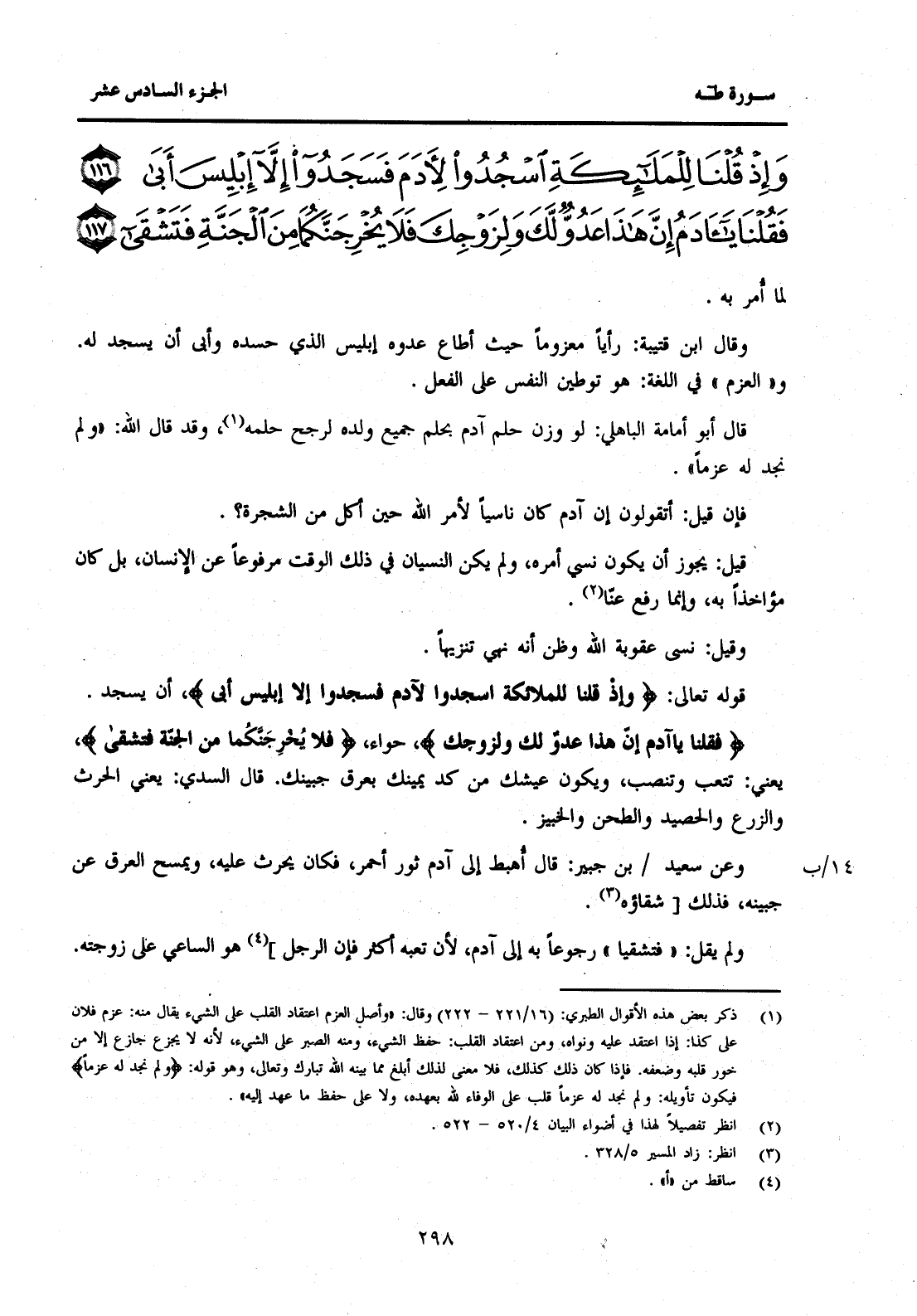 (1) ذكر بعض هذه الأقوال الطبري: (16 / 221 - 222) وقال: "وأصل العزم اعتقاد القلب على الشيء يقال منه: عزم فلان على كذا: إذا اعتقد عليه ونواه، ومن اعتقاد القلب: حفظ الشيء، ومنه الصبر على الشيء، لأنه لا يجزع جازع إلا من خور قلبه وضعفه، فإذا كان ذلك كذلك، فلا معنى لذلك أبلغ مما بينه الله تبارك وتعالى، وهو قوله: "ولم نجد له عزما" فيكون تأويله: ولم نجد له عزما قلب على الوفاء لله بعهده، ولا على حفظ ما عهد إليه".