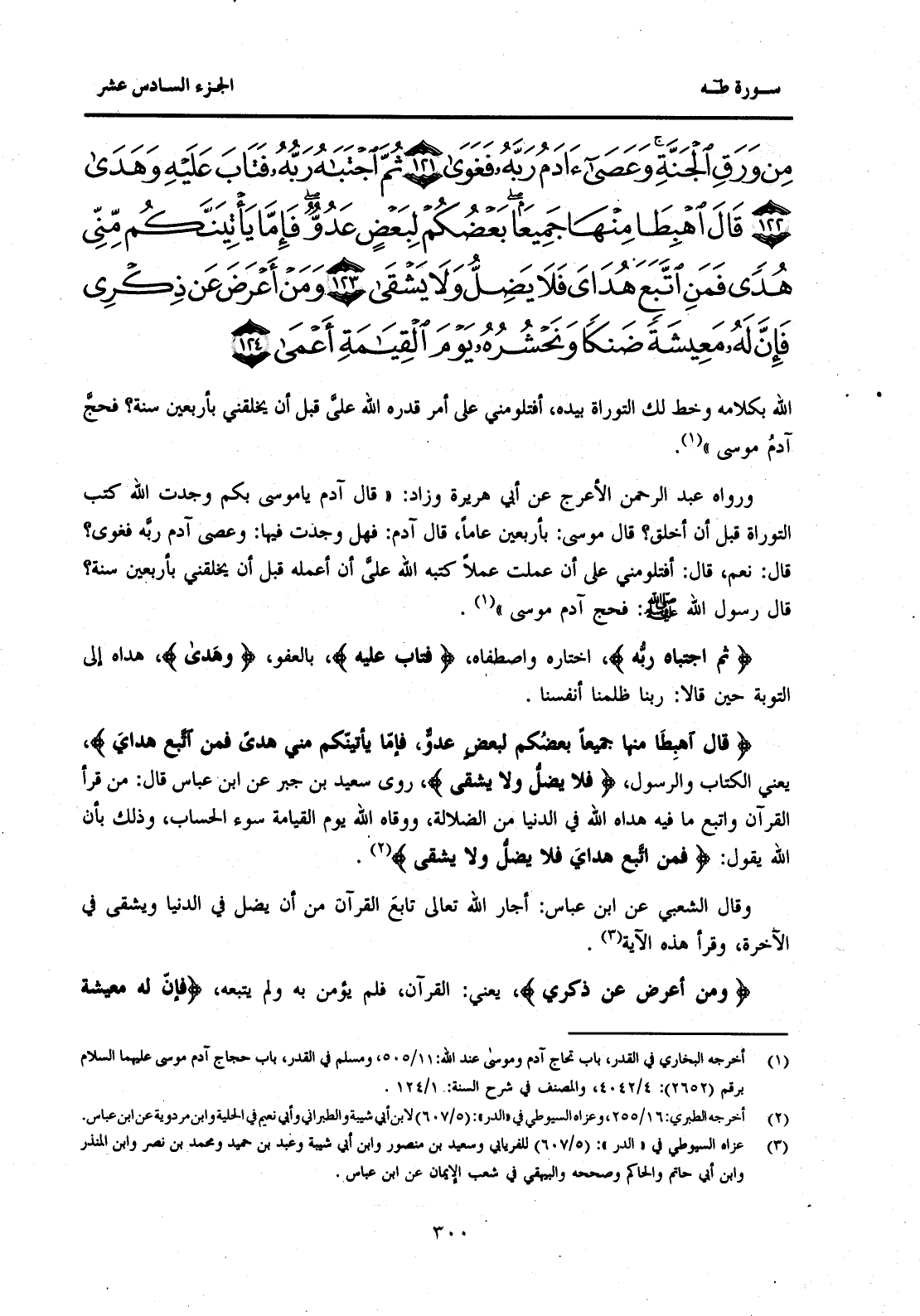 (1) أخرجه البخاري في القدر، باب تحاج آدم وموسى عند الله: 11 / 505، ومسلم في القدر، باب حجاج آدم موسى عليهما السلام برقم (2652) : 4 / 4042، والمصنف في شرح السنة: 1 / 124.