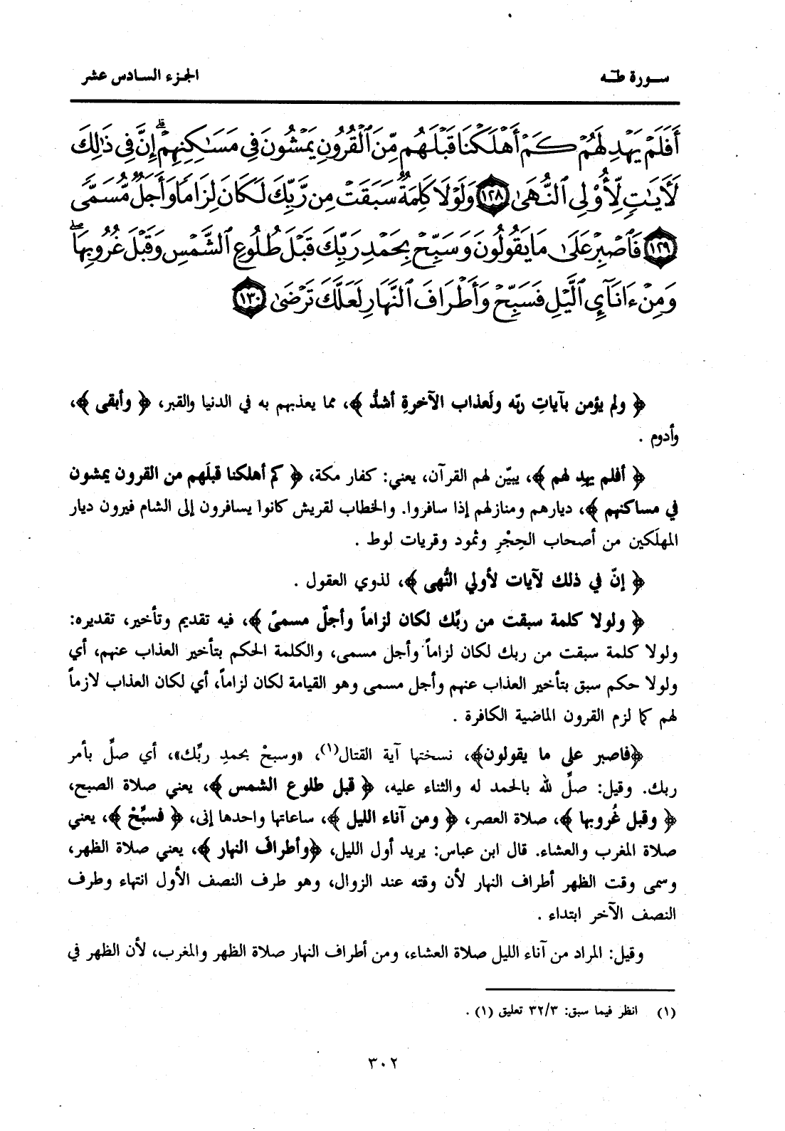 {أَفَلَمْ يَهْدِ لَهُمْ كَمْ أَهْلَكْنَا قَبْلَهُمْ مِنَ الْقُرُونِ يَمْشُونَ فِي مَسَاكِنِهِمْ إِنَّ فِي ذَلِكَ لِآيَاتٍ لِأُولِي النُّهَى (128) وَلَوْلَا كَلِمَةٌ سَبَقَتْ مِنْ رَبِّكَ لَكَانَ لِزَامًا وَأَجَلٌ مُسَمًّى (129) فَاصْبِرْ عَلَى مَا يَقُولُونَ وَسَبِّحْ بِحَمْدِ رَبِّكَ قَبْلَ طُلُوعِ الشَّمْسِ وَقَبْلَ غُرُوبِهَا وَمِنْ آنَاءِ اللَّيْلِ فَسَبِّحْ وَأَطْرَافَ النَّهَارِ لَعَلَّكَ تَرْضَى (130) }