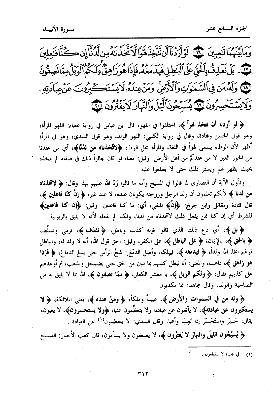 وَتَأْوِيلُ الْآيَةِ أَنَّ النَّصَارَى لَمَّا قَالُوا فِي الْمَسِيحِ وَأَمِّهِ مَا قَالُوا رَدَّ اللَّهُ عَلَيْهِمْ بِهَذَا وَقَالَ: {لَاتَّخَذْنَاهُ مِنْ لَدُنَّا} لِأَنَّكُمْ تَعْلَمُونَ أَنَّ وَلَدَ الرَّجُلِ وَزَوْجَتَهُ يَكُونَانِ عِنْدَهُ، لَا عِنْدَ غَيْرِهِ {إِنْ كُنَّا فَاعِلِينَ} قَالَ قَتَادَةُ وَمُقَاتِلٌ وَابْنُ جُرَيْجٍ: {إِنْ} لِلنَّفْي، أَيْ: مَا كُنَّا فَاعِلِينَ. وَقِيلَ: {إِنْ كُنَّا فَاعِلِينَ} لِلشَّرْطِ أَيْ إِنْ كُنَّا مِمَّنْ يَفْعَلُ ذَلِكَ لَاتَّخَذْنَاهُ مِنْ لَدُنَّا، وَلَكِنَّا لَمْ نَفْعَلْهُ لِأَنَّهُ لَا يَلِيقُ بِالرُّبُوبِيَّةِ. {بَلْ} أَيْ دَعْ ذَلِكَ الَّذِي قَالُوا فَإِنَّهُ كَذِبٌ وَبَاطِلٌ، {نَقْذِفُ} نَرْمِي وَنُسَلِّطُ، {بِالْحَقِّ} بِالْإِيمَانِ، {عَلَى الْبَاطِلِ} عَلَى الْكُفْرِ، وَقِيلَ: الْحَقُّ قَوْلُ اللَّهِ، أَنَّهُ لَا وَلَدَ لَهُ، وَالْبَاطِلُ قَوْلُهُمُ اتَّخَذَ اللَّهُ وَلَدًا، {فَيَدْمَغُهُ} فَيُهْلِكُهُ، وَأَصْلُ الدَّمْغِ: شَجُّ الرَّأْسِ حَتَّى يَبْلُغَ الدِّمَاغَ، {فَإِذَا هُوَ زَاهِقٌ} ذاهب، والمعنى: أنا نُبْطِلُ كَذِبَهُمْ بِمَا نُبَيِّنُ مِنَ الْحَقِّ حَتَّى يَضْمَحِلَّ وَيَذْهَبَ، ثُمَّ أَوْعَدَهَمْ عَلَى كَذِبِهِمْ فَقَالَ: {وَلَكُمُ الْوَيْلُ} يَا مَعْشَرَ الْكُفَّارِ، {مِمَّا تَصِفُونَ} اللَّهَ بِمَا لَا يَلِيقُ بِهِ مِنَ الصَّاحِبَةِ وَالْوَلَدِ. وَقَالَ مُجَاهِدٌ: مِمَّا تَكْذِبُونَ. {وَلَهُ مَنْ فِي السَّمَاوَاتِ وَالْأَرْضِ} عَبِيدًا وَمُلْكًا، {وَمَنْ عِنْدَهُ} يَعْنِي الْمَلَائِكَةَ، {لَا يَسْتَكْبِرُونَ عَنْ عِبَادَتِهِ} لَا يَأْنَفُونَ عَنْ عِبَادَتِهِ وَلَا يَتَعَظَّمُونَ عَنْهَا، {وَلَا يَسْتَحْسِرُونَ} لَا يَعْيَوْنَ، يُقَالُ: حَسِرَ وَاسْتَحْسَرَ إِذَا تَعِبَ وَأَعْيَا. وَقَالَ السُّدِّيُّ: لَا يَتَعَظَّمُونَ (1) عَنِ الْعِبَادَةِ. {يُسَبِّحُونَ اللَّيْلَ وَالنَّهَارَ لَا يَفْتُرُونَ} لَا يَضْعُفُونَ وَلَا يَسْأَمُونَ، قَالَ كَعْبُ الْأَحْبَارِ: التَّسْبِيحُ