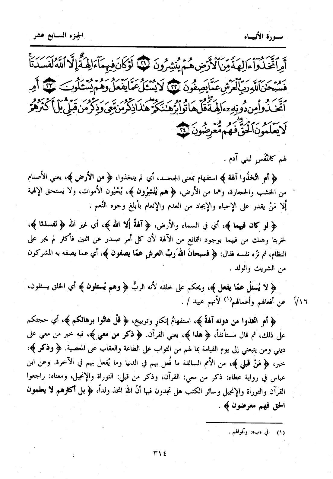 {أَمِ اتَّخَذُوا آلِهَةً مِنَ الْأَرْضِ هُمْ يُنْشِرُونَ (21) لَوْ كَانَ فِيهِمَا آلِهَةٌ إِلَّا اللَّهُ لَفَسَدَتَا فَسُبْحَانَ اللَّهِ رَبِّ الْعَرْشِ عَمَّا يَصِفُونَ (22) لَا يُسْأَلُ عَمَّا يَفْعَلُ وَهُمْ يُسْأَلُونَ (23) أَمِ اتَّخَذُوا مِنْ دُونِهِ آلِهَةً قُلْ هَاتُوا بُرْهَانَكُمْ هَذَا ذِكْرُ مَنْ مَعِيَ وَذِكْرُ مَنْ قَبْلِي بَلْ أَكْثَرُهُمْ لَا يَعْلَمُونَ الْحَقَّ فَهُمْ مُعْرِضُونَ (24) }