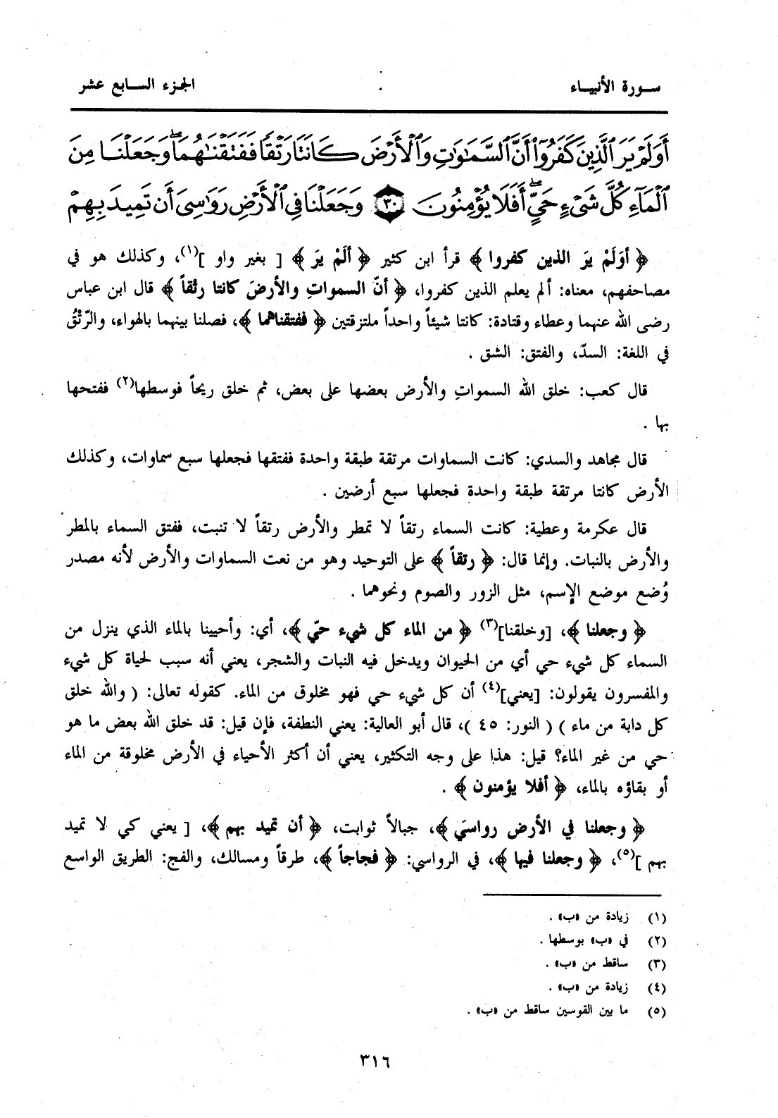 {أَوَلَمْ يَرَ الَّذِينَ كَفَرُوا أَنَّ السَّمَاوَاتِ وَالْأَرْضَ كَانَتَا رَتْقًا فَفَتَقْنَاهُمَا وَجَعَلْنَا مِنَ الْمَاءِ كُلَّ شَيْءٍ حَيٍّ أَفَلَا يُؤْمِنُونَ (30) وَجَعَلْنَا فِي الْأَرْضِ رَوَاسِيَ أَنْ تَمِيدَ بِهِمْ وَجَعَلْنَا فِيهَا فِجَاجًا سُبُلًا لَعَلَّهُمْ يَهْتَدُونَ (31) }