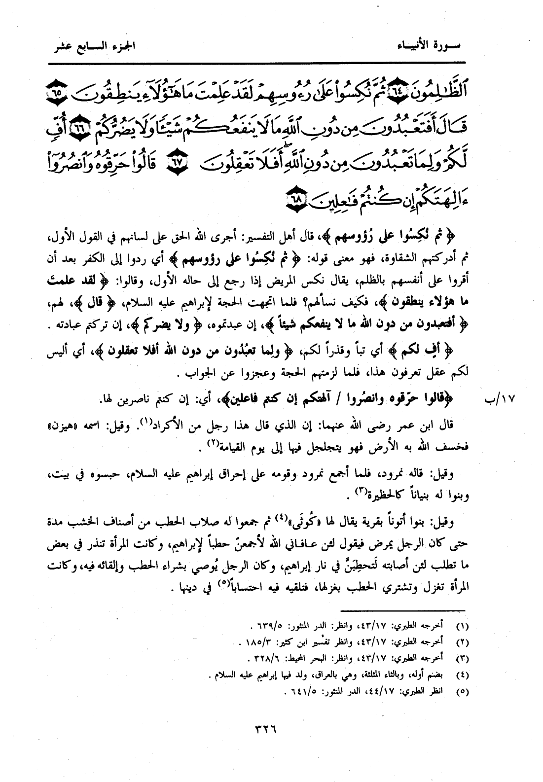 {ثُمَّ نُكِسُوا عَلَى رُءُوسِهِمْ} قَالَ أَهْلُ التَّفْسِيرِ: أَجْرَى اللَّهُ الْحَقَّ عَلَى لِسَانِهِمْ فِي الْقَوْلِ الْأَوَّلِ، ثُمَّ أَدْرَكَتْهُمُ الشَّقَاوَةُ، فَهُوَ مَعْنَى قَوْلِهِ: {ثُمَّ نُكِسُوا عَلَى رُءُوسِهِمْ} أَيْ رُدُّوا إِلَى الْكُفْرِ بَعْدَ أَنْ أَقَرُّوا عَلَى أَنْفُسِهِمْ بِالظُّلْمِ، يُقَالُ نُكِسَ الْمَرِيضُ إِذَا رَجَعَ إِلَى حَالِهِ الْأَوَّلِ، وَقَالُوا: {لَقَدْ عَلِمْتَ مَا هَؤُلَاءِ يَنْطِقُونَ} فَكَيْفَ نَسْأَلُهُمْ؟ فَلَمَّا اتَّجَهَتِ الْحُجَّةُ لِإِبْرَاهِيمَ عَلَيْهِ السَّلَامُ. {قَالَ} لَهُمْ، {أَفَتَعْبُدُونَ مِنْ دُونِ اللَّهِ مَا لَا يَنْفَعُكُمْ شَيْئًا} إِنْ عَبَدْتُمُوهُ، {وَلَا يَضُرُّكُمْ} إِنْ تَرَكْتُمْ عِبَادَتَهُ. {أُفٍّ لَكُمْ} أَيْ تَبًّا وَقَذَرًا لَكُمْ، {وَلِمَا تَعْبُدُونَ مِنْ دُونِ اللَّهِ أَفَلَا تَعْقِلُونَ} أَيْ أَلَيْسَ لَكُمْ عَقْلٌ تَعْرِفُونَ هَذَا، فَلَمَّا لَزِمَتْهُمُ الْحُجَّةُ وَعَجَزُوا عَنِ الْجَوَابِ. {قَالُوا حَرِّقُوهُ وَانْصُرُوا آلِهَتَكُمْ إِنْ كُنْتُمْ فَاعِلِينَ} 17/ب أَيْ: إِنْ كُنْتُمْ نَاصِرِينَ لَهَا.