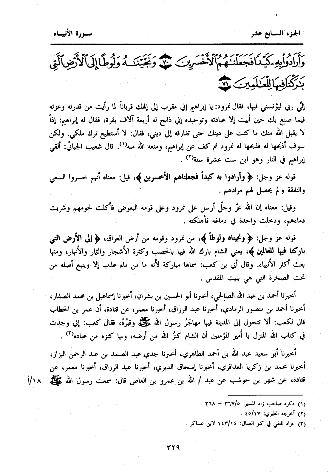 وَقِيلَ: مَعْنَاهُ إِنَّ اللَّهَ عَزَّ وَجَلَّ أَرْسَلَ عَلَى نَمْرُودَ وَعَلَى قَوْمِهِ الْبَعُوضَ فَأَكَلَتْ لُحُومَهُمْ وَشَرِبَتْ دِمَاءَهُمْ، وَدَخَلَتْ وَاحِدَةٌ فِي دِمَاغِهِ فَأَهْلَكَتْهُ. قَوْلُهُ عَزَّ وَجَلَّ: {وَنَجَّيْنَاهُ وَلُوطًا} مِنْ نَمْرُودَ وَقَوْمِهِ مِنْ أَرْضِ الْعِرَاقِ، {إِلَى الْأَرْضِ الَّتِي بَارَكْنَا فِيهَا لِلْعَالَمِينَ} يَعْنِي الشَّامَ بَارَكَ اللَّهُ فِيهَا بِالْخِصْبِ وَكَثْرَةِ الْأَشْجَارِ وَالثِّمَارِ وَالْأَنْهَارِ، وَمِنْهَا بَعْثُ أَكْثَرِ الْأَنْبِيَاءِ. وَقَالَ أُبَيُّ بْنُ كَعْبٍ: سَمَّاهَا مُبَارَكَةً لِأَنَّهُ مَا مِنْ مَاءٍ عَذْبٍ إِلَّا وَيَنْبُعُ أَصْلُهُ مِنْ تَحْتِ الصَّخْرَةِ الَّتِي هِيَ بِبَيْتِ الْمَقْدِسِ.