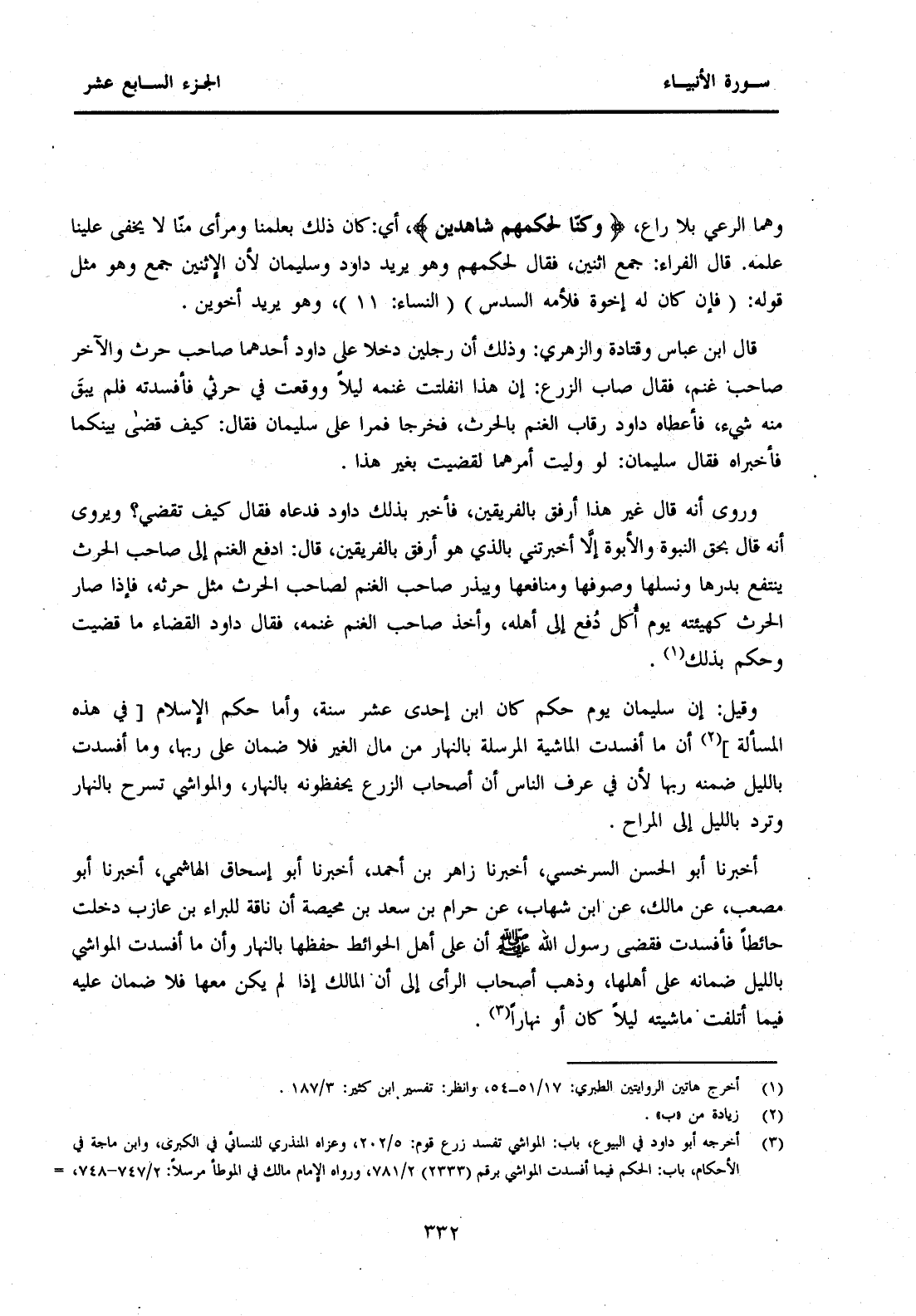 قَالَ ابْنُ عَبَّاسٍ وَقَتَادَةُ وَالزُّهْرِيُّ: وَذَلِكَ أَنَّ رَجُلَيْنِ دَخَلَا عَلَى دَاوُدَ أَحَدُهُمَا صَاحِبُ حَرْثٍ وَالْآخَرُ صَاحِبُ غَنَمٍ، فَقَالَ صَاحِبُ الزَّرْعِ: إِنَّ هَذَا انْفَلَتَتْ غَنَمُهُ لَيْلًا وَوَقَعَتْ فِي حَرْثِي فَأَفْسَدَتْهُ فَلَمْ يَبْقَ مِنْهُ شَيْءٌ، فَأَعْطَاهُ دَاوُدُ رِقَابَ الْغَنَمِ بِالْحَرْثِ، فَخَرَجَا فَمَرَّا عَلَى سُلَيْمَانَ فَقَالَ: كَيْفَ قَضَى بَيْنَكُمَا فَأَخْبَرَاهُ فَقَالَ سُلَيْمَانُ: لَوْ وُلِّيتُ أَمْرَهُمَا لَقَضَيْتُ بِغَيْرِ هَذَا.