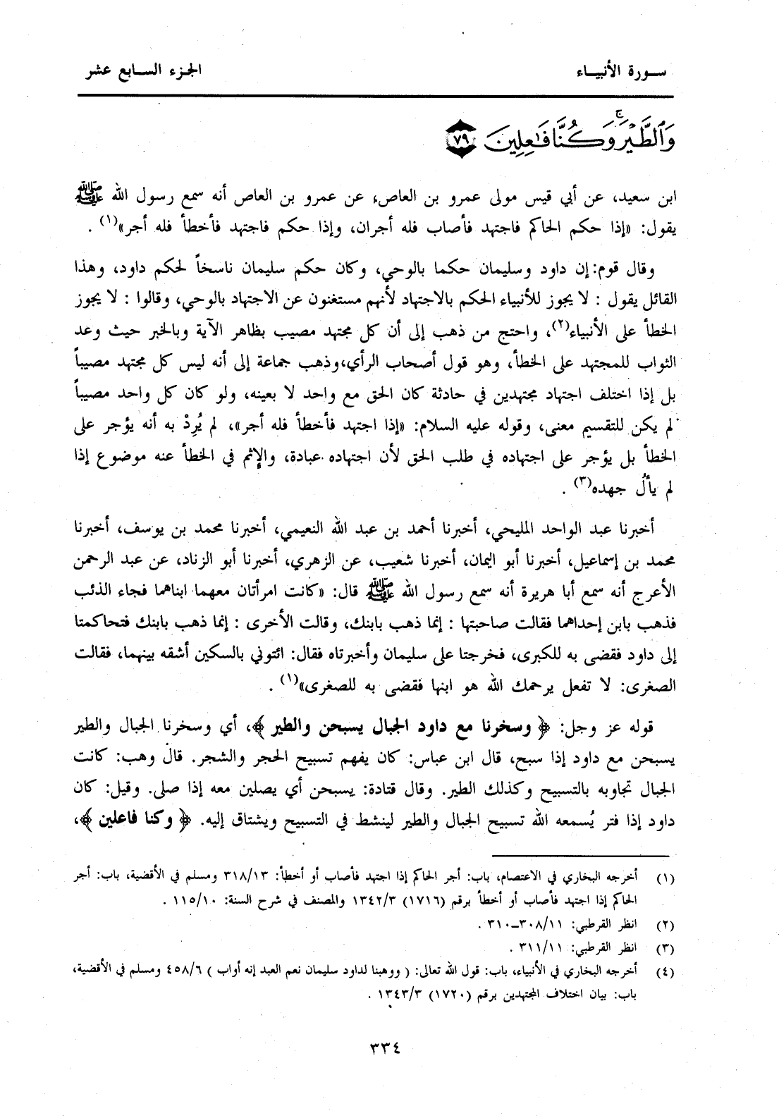(4) أخرجه البخاري في الأنبياء، باب: قول الله تعالى: (ووهبنا لداود سليمان نعم العبد إنه أواب) 6 / 458 ومسلم في الأقضية، باب: بيان اختلاف المجتهدين برقم (1720) 3 / 1343.
