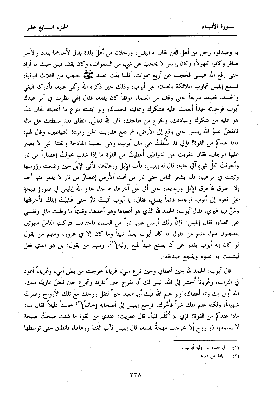 بِهِ وَصَدَّقُوهُ رَجُلٌ مِنْ أَهْلِ الْيَمَنِ يقال له اليقين، وَرَجُلَانِ مِنْ أَهْلِ بَلْدَةٍ يُقَالُ لِأَحَدِهِمَا يَلْدَدُ وَالْآخَرُ صَافِرُ وَكَانُوا كُهُولًا وَكَانَ إِبْلِيسُ لَا يُحْجَبُ عَنْ شَيْءٍ مِنَ السَّمَوَاتِ، وَكَانَ يَقِفُ فِيهِنَّ حَيْثُ مَا أَرَادَ حَتَّى رَفَعَ اللَّهُ عِيسَى فَحُجِبَ عَنْ أَرْبَعِ سَمَوَاتٍ، فَلَمَّا بُعِثَ مُحَمَّدٌ صَلَّى اللَّهُ عَلَيْهِ وَسَلَّمَ حُجِبَ مِنَ الثَّلَاثِ الْبَاقِيَةِ، فَسَمِعَ إِبْلِيسُ تَجَاوُبَ الْمَلَائِكَةِ بِالصَّلَاةِ عَلَى أَيُّوبَ، وَذَلِكَ حِينَ ذَكَرَهُ اللَّهُ وَأَثْنَى عَلَيْهِ، فَأَدْرَكَهُ الْبَغْيُ وَالْحَسَدُ، فَصَعَدَ سَرِيعًا حَتَّى وَقَفَ مِنَ السَّمَاءِ مَوْقِفًا كَانَ يَقِفُهُ، فَقَالَ إِلَهِي نَظَرْتُ فِي أَمْرِ عَبْدِكَ أَيُّوبَ فَوَجَدْتُهُ عَبْدًا أَنْعَمْتَ عَلَيْهِ فَشَكَرَكَ وَعَافَيْتَهُ فَحَمِدَكَ، وَلَوِ ابْتَلَيْتَهُ بِنَزْعِ مَا أَعْطَيْتَهُ لَحَالَ عَمَّا هُوَ عَلَيْهِ مِنْ شُكْرِكَ وَعِبَادَتِكَ، وَلَخَرَجَ مِنْ طَاعَتِكَ، قَالَ اللَّهُ تَعَالَى: انْطَلِقْ فَقَدْ سَلَّطْتُكَ عَلَى مَالِهِ فَانْقَضَّ عَدُوُّ اللَّهِ إِبْلِيسُ حَتَّى وَقَعَ إِلَى الْأَرْضِ، ثُمَّ جَمَعَ عَفَارِيتَ الْجِنِّ وَمَرَدَةَ الشَّيَاطِينِ، وَقَالَ لَهُمْ: مَاذَا عِنْدَكُمْ مِنَ الْقُوَّةِ؟ فَإِنِّي قَدْ سُلِّطْتُ عَلَى مَالِ أَيُّوبَ، وَهِيَ الْمُصِيبَةُ الْفَادِحَةُ وَالْفِتْنَةُ الَّتِي لَا يَصْبِرُ عَلَيْهَا الرِّجَالُ، فَقَالَ عِفْرِيتٌ مِنَ الشَّيَاطِينِ أُعْطِيتُ مِنَ الْقُوَّةِ مَا إِذَا شِئْتُ تَحَوَّلْتُ إِعْصَارًا مِنْ نَارٍ وَأَحْرَقْتُ كُلَّ شَيْءٍ آتِي عَلَيْهِ، قَالَ لَهُ إِبْلِيسُ: فَأْتِ الْإِبِلَ وَرِعَاءَهَا، فَأَتَى الْإِبِلَ حِينَ وَضَعَتْ رُءُوسَهَا وَثَبَتَتْ فِي مَرَاعِيهَا، فَلَمْ يَشْعُرِ النَّاسُ حَتَّى ثَارَ مِنْ تَحْتِ الْأَرْضِ إِعْصَارٌ مِنْ نَارٍ لَا يَدْنُو مِنْهَا أَحَدٌ إِلَّا احْتَرَقَ فَأَحْرَقَ الْإِبِلَ وَرِعَاءَهَا، حَتَّى أَتَى عَلَى آخِرِهَا، ثُمَّ جَاءَ عَدُوُّ اللَّهِ إِبْلِيسُ فِي صُورَةٍ قَبِيحَةٍ عَلَى قَعُودٍ إِلَى أَيُّوبَ فَوَجَدَهُ قَائِمًا يُصَلِّي، فَقَالَ: يَا أَيُّوبُ أَقْبَلَتْ نَارٌ حَتَّى غَشِيَتْ إِبِلَكَ فَأَحْرَقَتْهَا وَمَنْ فِيهَا غَيْرِي، فَقَالَ أَيُّوبُ: الْحَمْدُ لِلَّهِ الَّذِي هُوَ أَعْطَاهَا وَهُوَ أَخَذَهَا، وَقَدِيمًا مَا وَطَّنْتُ مَالِي وَنَفْسِي عَلَى الْفَنَاءِ، فَقَالَ إِبْلِيسُ: فَإِنَّ رَبَّكَ أَرْسَلَ عَلَيْهَا نَارًا مِنَ السَّمَاءِ فَاحْتَرَقَتْ فَتَرَكَتِ النَّاسَ مَبْهُوتِينَ يَتَعَجَّبُونَ مِنْهَا، مِنْهُمْ مَنْ يَقُولُ مَا كَانَ أَيُّوبُ يَعْبُدُ شَيْئًا وَمَا كَانَ إِلَّا فِي غُرُورٍ، وَمِنْهُمْ مَنْ يَقُولُ لَوْ كَانَ إِلَهُ أَيُّوبَ يَقْدِرُ عَلَى أَنْ يَصْنَعَ شَيْئًا لَمَنَعَ [وَلِيَّهُ] (1) وَمِنْهُمْ مَنْ يَقُولُ: بَلْ هُوَ الَّذِي فَعَلَ لِيُشْمِتَ بِهِ عَدُوَّهُ وَيُفْجِعَ بِهِ صَدِيقَهُ.