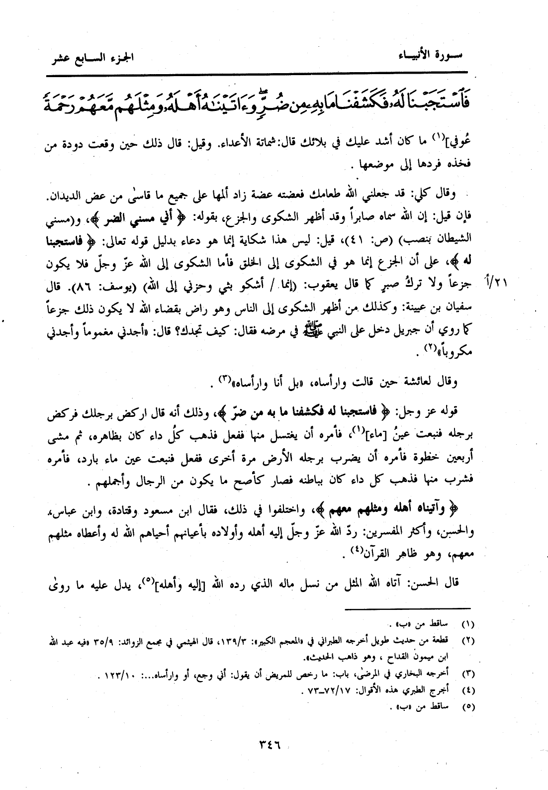 وَقَالَ كُلِي: فَقَدْ جَعَلَنِي اللَّهُ طَعَامَكِ فَعَضَّتْهُ عَضَّةً زَادَ أَلَمُهَا عَلَى جَمِيعِ مَا قَاسَى مِنْ عَضِّ الدِّيدَانِ. فَإِنْ قِيلَ: إِنَّ اللَّهَ سَمَّاهُ صَابِرًا وَقَدْ أَظْهَرَ الشَّكْوَى وَالْجَزَعَ، بِقَوْلِهِ: {إِنِّي مَسَّنِيَ الضُّرُّ} وَ {مَسَّنِيَ الشَّيْطَانُ بِنُصْبٍ} (ص: 41) ، قِيلَ: لَيْسَ هَذَا شِكَايَةً إِنَّمَا هُوَ دُعَاءٌ بِدَلِيلِ قَوْلِهِ تَعَالَى: {فَاسْتَجَبْنَا لَهُ} عَلَى أَنَّ الْجَزَعَ إِنَّمَا هُوَ فِي الشَّكْوَى إِلَى الْخَلْقِ فَأَمَّا الشَّكْوَى إِلَى اللَّهِ عَزَّ وَجَلَّ فَلَا يَكُونُ جَزَعًا وَلَا تَرْكَ صَبْرٍ كَمَا قَالَ يعقوب: {إِنَّمَا 21/أأَشْكُو بَثِّي وَحُزْنِي إِلَى اللَّهِ} (يُوسُفَ: 86) . قَالَ سُفْيَانُ بْنُ عُيَيْنَةَ: وَكَذَلِكَ مَنْ أَظْهَرَ الشَّكْوَى إِلَى النَّاسِ وَهُوَ رَاضٍ بِقَضَاءِ اللَّهِ لَا يَكُونُ ذَلِكَ جَزَعًا كَمَا رُوِيَ أَنَّ جِبْرِيلَ دَخْلَ عَلَى النَّبِيِّ صَلَّى اللَّهُ عَلَيْهِ وَسَلَّمَ فِي مَرَضِهِ فَقَالَ: كَيْفَ تَجِدُكَ؟ قَالَ: "أَجِدُنِي مَغْمُومًا وَأَجِدُنِي مَكْرُوبًا" (2) .