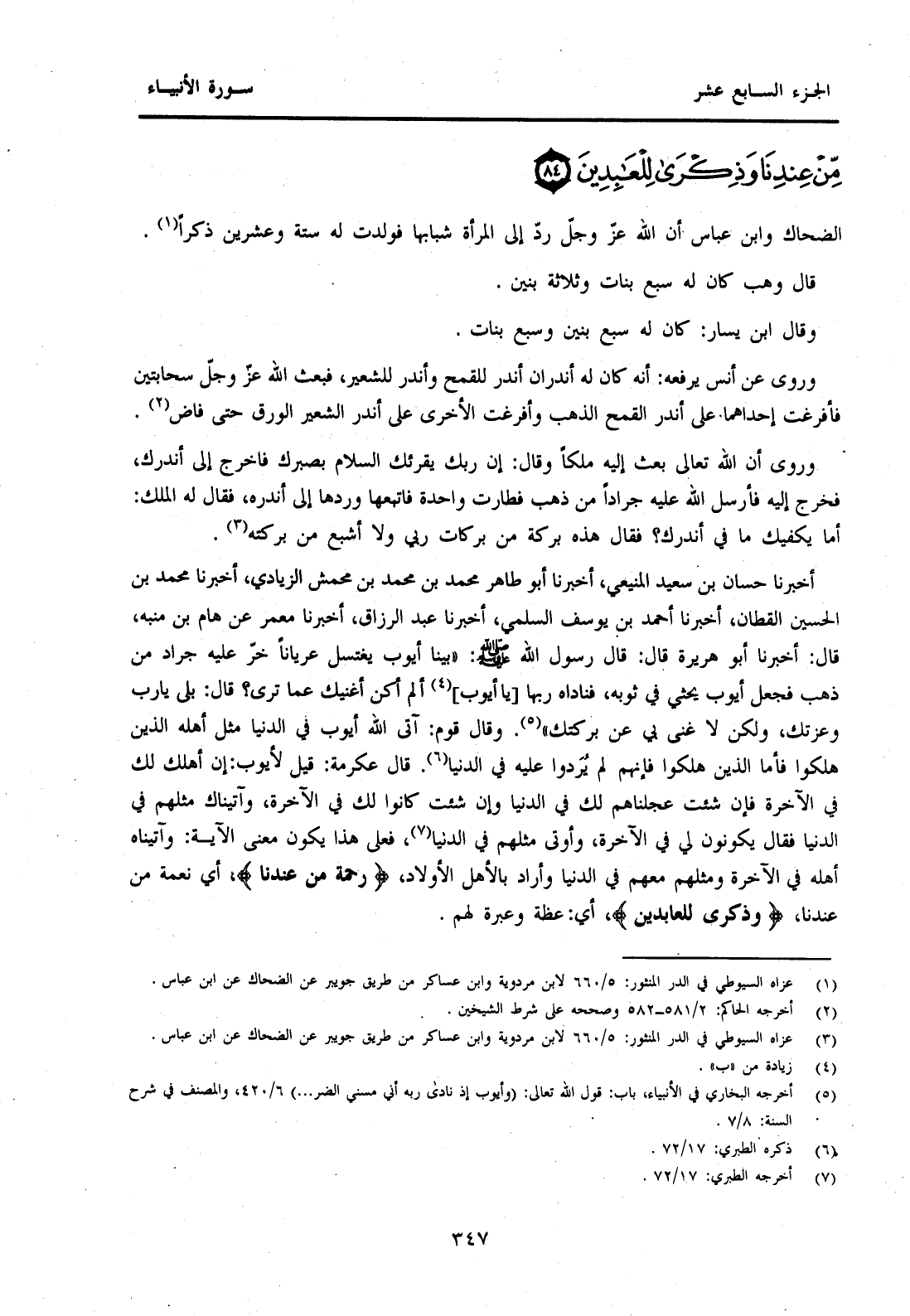 أَخْبَرَنَا حَسَّانُ بْنُ سَعِيدٍ الْمَنِيعِيُّ، أَخْبَرَنَا أَبُو طَاهِرٍ مُحَمَّدُ بْنُ مُحَمَّدِ بْنِ مَحْمِشٍ الزِّيَادِيُّ، أَخْبَرَنَا مُحَمَّدُ بْنُ الْحُسَيْنِ الْقَطَّانُ، أَخْبَرَنَا أَحْمَدُ بْنُ يُوسُفَ السُّلَمِيُّ، أَخْبَرَنَا عَبْدُ الرَّزَّاقِ، أَخْبَرَنَا مَعْمَرٌ عَنْ هَمَّامِ بْنِ مُنَبِّهٍ، قَالَ: أَخْبَرَنَا أَبُو هُرَيْرَةَ قَالَ: قَالَ رَسُولُ اللَّهِ صَلَّى اللَّهُ عَلَيْهِ وَسَلَّمَ: "بَيْنَا أَيُّوبُ يَغْتَسِلُ عُرْيَانًا خَرَّ عَلَيْهِ جَرَادٌ مِنْ ذَهَبٍ فَجَعَلَ أَيُّوبُ يَحْثِي فِي ثَوْبِهِ، فَنَادَاهُ رَبُّهُ [يَا أَيُّوبُ] (4) أَلَمْ أَكُنْ أُغْنِيكَ عَمَّا تَرَى؟ قَالَ: بَلَى يَا رَبِّ وَعَزَّتِكِ، وَلَكِنْ لَا غِنَى بِي عَنْ بَرَكَتِكِ" (5) . وَقَالَ قَوْمٌ: أَتَى اللَّهُ أَيُّوبَ فِي الدُّنْيَا مِثْلَ أَهْلِهِ الَّذِينَ هَلَكُوا فَأَمَّا الَّذِينَ هَلَكُوا فَإِنَّهُمْ لَمْ يُرَدُّوا عَلَيْهِ فِي الدُّنْيَا (6) قَالَ عِكْرِمَةُ: قِيلَ لِأَيُّوبَ: إِنَّ أَهْلَكَ لَكَ فِي الْآخِرَةِ فَإِنْ شِئْتَ عَجَّلْنَاهُمْ لَكَ فِي الدُّنْيَا وَإِنْ شِئْتَ كَانُوا لَكَ فِي الْآخِرَةِ، وَآتَيْنَاكَ مِثْلَهُمْ فِي الدُّنْيَا فَقَالَ يَكُونُونَ لِي فِي الْآخِرَةِ، وَأُوتَى مِثْلَهُمْ فِي الدُّنْيَا (7) فَعَلَى هَذَا يَكُونُ مَعْنَى الْآيَةِ: وَآتَيْنَاهُ أَهْلَهُ فِي الْآخِرَةِ وَمِثْلَهُمْ مَعَهُمْ فِي الدُّنْيَا وَأَرَادَ بِالْأَهْلِ الْأَوْلَادَ، {رَحْمَةً مِنْ عِنْدِنَا} أَيْ نِعْمَةً مِنْ عِنْدِنَا، {وَذِكْرَى لِلْعَابِدِينَ} أَيْ: عِظَةً وَعِبْرَةً لَهُمْ.