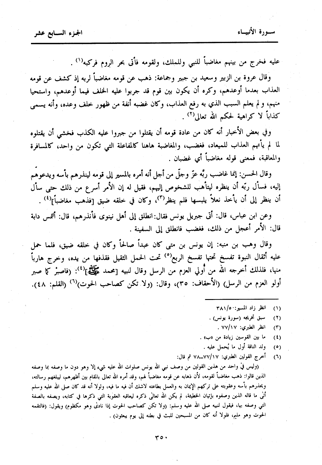 (7) أخرج القولين الطبري: 17 / 77 - 78 ثم قال: (وليس في واحد من هذين القولين من وصف نبي الله يونس صلوات الله عليه شيء إلا وهو دون ما وصفه بما وصفه الذين قالوا: ذهب مغاضبا لقومه، لأن ذهابه عن قومه مغاضبا لهم، وقد أمره الله تعالى بالمقام بين أظهرهم، ليبلغهم رسالته، ويحذرهم بأسه وعقوبته على تركهم الإيمان به والعمل بطاعته لا شك أن فيه ما فيه، ولولا أنه قد كان صَلَّى اللَّهُ عَلَيْهِ وَسَلَّمَ أتى ما قاله الذين وصفوه بإتيان الخطيئة، لم يكن الله تعالى ذكره ليعاقبه العقوبة التي ذكرها في كتابه، ويصفه بالصفة التي وصفه بها، فيقول لنبيه صَلَّى اللَّهُ عَلَيْهِ وَسَلَّمَ: (ولا تكن كصاحب الحوت إذ نادى وهو مكظوم) ويقول: (فالتقمه الحوت وهو مليم، فلولا أنه كان من المسبحين للبث في بطنه إلى يوم يبعثون) .