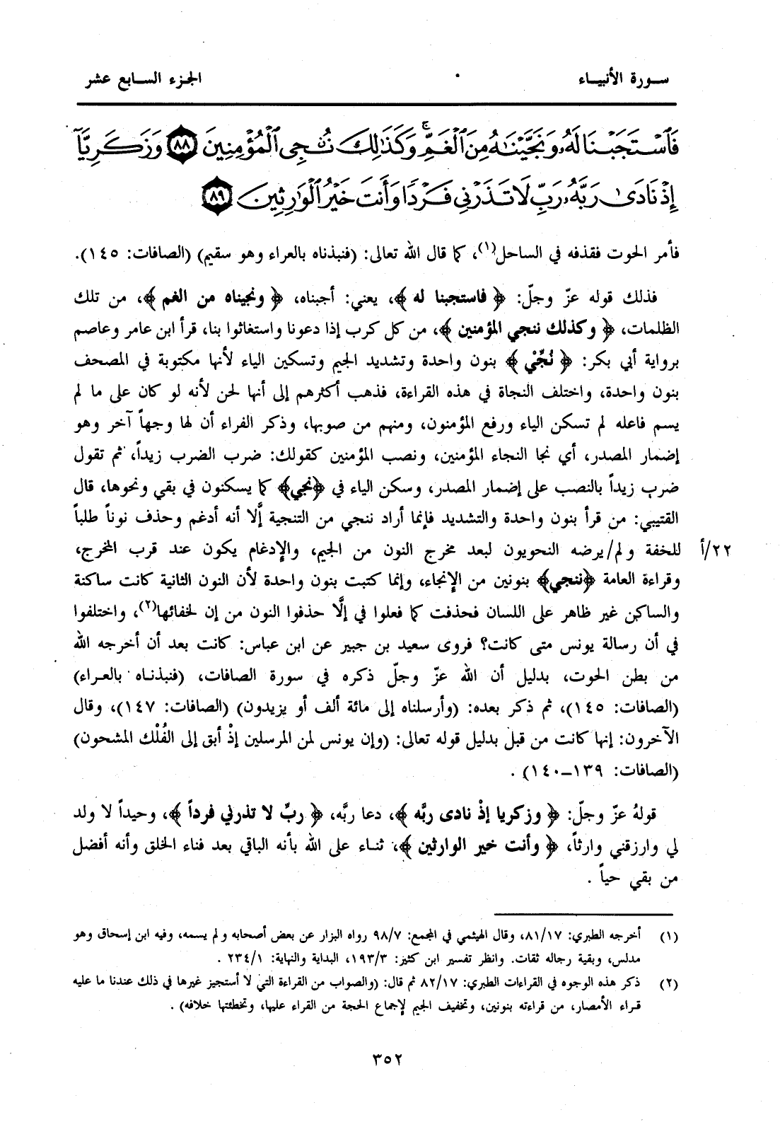 فَلِذَلِكَ قَوْلُهُ عَزَّ وَجَلَّ: {فَاسْتَجَبْنَا لَهُ} يَعْنِي: أَجَبْنَاهُ، {وَنَجَّيْنَاهُ مِنَ الْغَمِّ} مِنْ تِلْكَ الظُّلُمَاتِ، {وَكَذَلِكَ نُنْجِي الْمُؤْمِنِينَ} مِنْ كُلِّ كَرْبٍ إِذَا دَعَوْنَا وَاسْتَغَاثُوا بِنَا، قَرَأَ ابْنُ عَامِرٍ وَعَاصِمٌ بِرِوَايَةِ أَبِي بَكْرٍ: " نُجِّي " بِنُونٍ وَاحِدَةٍ وَتَشْدِيدِ الْجِيمِ وَتَسْكِينِ الْيَاءِ لِأَنَّهَا مَكْتُوبَةٌ فِي الْمُصْحَفِ بِنُونٍ وَاحِدَةٍ، وَاخْتَلَفَ النُّحَاةُ فِي هَذِهِ الْقِرَاءَةِ، فَذَهَبَ أَكْثَرُهُمْ إِلَى أَنَّهَا لَحْنٌ لِأَنَّهُ لَوْ كَانَ عَلَى مَا لَمْ يُسَمَّ فَاعِلُهُ لَمْ تَسْكُنِ الْيَاءُ وَرُفِعَ الْمُؤْمِنُونَ، وَمِنْهُمْ مَنْ صَوَّبَهَا، وَذَكَرَ الْفَرَّاءُ أَنَّ لَهَا وَجْهًا آخَرَ وَهُوَ إِضْمَارُ الْمَصْدَرِ، أَيْ نَجَا النِّجَاءَ الْمُؤْمِنِينَ، وَنَصَبَ الْمُؤْمِنِينَ كَقَوْلِكَ: ضَرَبَ الضَّرْبَ زَيْدًا، ثُمَّ تَقُولُ ضَرَبَ زَيْدًا بالنصب على إضماء الْمَصْدَرِ، وَسَكَّنَ الْيَاءَ فِي " نُجِّي " كَمَا يُسَكِّنُونَ فِي بَقِيَ وَنَحْوِهَا، قَالَ القُتَيْبِيُّ مَنْ قَرَأَ بِنُونٍ وَاحِدَةٍ وَالتَّشْدِيدِ فَإِنَّمَا أَرَادَ نُنْجِي مِنَ التَّنْجِيَةِ إِلَّا أَنَّهُ أَدْغَمَ وَحَذَفَ نُونًا طَلَبًا للخفة ولم 22/أيَرْضَهُ النَّحْوِيُّونَ لِبُعْدِ مَخْرَجِ النُّونِ مِنَ الْجِيمِ، وَالْإِدْغَامُ يَكُونُ عِنْدَ قُرْبِ الْمَخْرَجِ، وَقِرَاءَةُ الْعَامَّةِ {نُنْجِي} بِنُونَيْنِ مِنَ الْإِنْجَاءِ، وَإِنَّمَا كُتِبَتْ بِنُونٍ وَاحِدَةٍ لِأَنَّ النُّونَ الثَّانِيَةَ كَانَتْ سَاكِنَةً وَالسَّاكِنُ غَيْرُ ظَاهِرٍ عَلَى اللِّسَانِ فَحُذِفَتْ كَمَا فَعَلُوا فِي إِلَّا حَذَفُوا النُّونَ مِنْ إِنْ لِخَفَائِهَا (2) وَاخْتَلَفُوا فِي أَنَّ رِسَالَةَ يُونُسَ مَتَى كَانْتْ؟ فَرَوَى سَعِيدُ بْنُ جُبَيْرٍ عَنِ ابْنِ عَبَّاسٍ: كَانَتْ بَعْدَ أَنْ أَخْرَجَهُ اللَّهُ مِنْ بَطْنِ الْحُوتِ، بِدَلِيلِ أَنَّ اللَّهَ عَزَّ وَجَلَّ ذَكَرَهُ فِي سُورَةِ الصَّافَّاتِ، {فَنَبَذْنَاهُ بِالْعَرَاءِ} (الصَّافَّاتِ: 145) ، ثُمَّ ذَكَرَ بَعْدَهُ: {وَأَرْسَلْنَاهُ إِلَى مِائَةِ أَلْفٍ أَوْ يَزِيدُونَ} (الصَّافَّاتِ: 147) ، وَقَالَ الْآخَرُونَ: إِنَّهَا كَانَتْ مِنْ قَبْلُ بِدَلِيلِ قَوْلِهِ تَعَالَى: {وَإِنَّ يُونُسَ لَمِنَ الْمُرْسَلِينَ إِذْ أَبَقَ إِلَى الْفُلْكِ الْمَشْحُونِ} (الصَّافَّاتِ: 139 -140) . قَوْلُهُ عَزَّ وَجَلَّ: {وَزَكَرِيَّا إِذْ نَادَى رَبَّهُ} دَعَا رَبَّهُ، {رَبِّ لَا تَذَرْنِي فَرْدًا} وَحِيدًا لَا وَلَدَ لِي وَارْزُقْنِي وَارِثًا، {وَأَنْتَ خَيْرُ الْوَارِثِينَ} ثَنَاءٌ عَلَى اللَّهِ بِأَنَّهُ الْبَاقِي بَعْدَ فَنَاءِ الْخَلْقِ وَأَنَّهُ أَفْضَلُ مَنْ بَقِيَ حَيًّا.