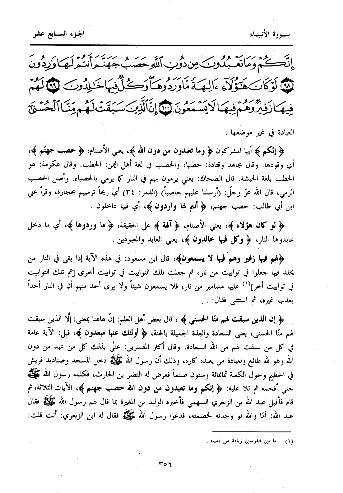 {إِنَّكُمْ} أَيُّهَا الْمُشْرِكُونَ {وَمَا تَعْبُدُونَ مِنْ دُونِ اللَّهِ} يَعْنِي الْأَصْنَامَ، {حَصَبُ جَهَنَّمَ} أَيْ وَقُودُهَا. وَقَالَ مُجَاهِدٌ وَقَتَادَةُ: حَطَبُهَا، وَالْحَصَبُ فِي لُغَةِ أَهْلِ الْيَمَنِ: الْحَطَبُ. وَقَالَ عِكْرِمَةُ: هُوَ الْحَطَبُ بِلُغَةِ الْحَبَشَةِ. قَالَ الضَّحَّاكُ: يَعْنِي يَرْمُونَ بِهِمْ فِي النَّارِ كَمَا يُرْمَى بِالْحَصْبَاءِ. وَأَصْلُ الْحَصَبِ الرَّمْيُ، قَالَ اللَّهُ عَزَّ وَجَلَّ: {أَرْسَلْنَا عَلَيْهِمْ حَاصِبًا} (الْقَمَرِ: 34) أَيْ رِيحًا تَرْمِيهِمْ بِحِجَارَةٍ، وَقَرَأَ عَلِيُّ بْنُ أَبِي طَالِبٍ: حَطَبُ جَهَنَّمَ، {أَنْتُمْ لَهَا وَارِدُونَ} أَيْ فِيهَا دَاخِلُونَ. {لَوْ كَانَ هَؤُلَاءِ} يَعْنِي الْأَصْنَامَ، {آلِهَةً} عَلَى الْحَقِيقَةِ، {مَا وَرَدُوهَا} أَيْ مَا دَخَلَ عَابِدُوهَا النَّارَ، {وَكُلٌّ فِيهَا خَالِدُونَ} يَعْنِي الْعَابِدَ وَالْمَعْبُودِينَ. {لَهُمْ فِيهَا زَفِيرٌ وَهُمْ فِيهَا لَا يَسْمَعُونَ} قَالَ ابْنُ مَسْعُودٍ: فِي هَذِهِ الْآيَةِ إِذَا بَقِيَ فِي النَّارِ مَنْ يَخْلُدُ فِيهَا جُعِلُوا فِي تَوَابِيتَ مِنْ نَارٍ، ثُمَّ جُعِلَتْ تِلْكَ التَّوَابِيتُ فِي تَوَابِيتَ أُخْرَى [ثُمَّ تِلْكَ التَّوَابِيتُ فِي تَوَابِيتَ أُخَرَ] (1) عَلَيْهَا مَسَامِيرُ مِنْ نَارٍ، فَلَا يَسْمَعُونَ شَيْئًا وَلَا يَرَى أَحَدٌ مِنْهُمْ أَنَّ فِي النَّارِ أَحَدًا يُعَذَّبُ غَيْرَهُ، ثُمَّ اسْتَثْنَى فَقَالَ:. {إِنَّ الَّذِينَ سَبَقَتْ لَهُمْ مِنَّا الْحُسْنَى} قَالَ بَعْضُ أَهْلِ الْعِلْمِ: إِنَّ هَاهُنَا بِمَعْنَى: إِلَّا الَّذِينَ سَبَقَتْ لَهُمْ مِنَّا الْحُسْنَى، يَعْنِي السَّعَادَةَ وَالْعِدَّةَ الْجَمِيلَةَ بِالْجَنَّةِ، {أُولَئِكَ عَنْهَا مُبْعَدُونَ} قِيلَ: الْآيَةُ عَامَّةٌ فِي كُلِّ مَنْ سَبَقَتْ لَهُمْ مِنَ اللَّهِ السَّعَادَةُ. وَقَالَ أَكْثَرُ الْمُفَسِّرِينَ: عَنِيَ بِذَلِكَ كُلَّ مَنْ عُبِدَ مِنْ دُونِ اللَّهِ وَهُوَ لِلَّهِ طَائِعٌ وَلِعِبَادَةِ مَنْ يَعْبُدُهُ كَارِهٌ، وَذَلِكَ أَنَّ رَسُولَ اللَّهِ صَلَّى اللَّهُ عَلَيْهِ وَسَلَّمَ دَخْلَ الْمَسْجِدَ وَصَنَادِيدَ قُرَيْشٍ فِي الْحَطِيمِ وَحَوْلَ الْكَعْبَةِ ثَلَاثُمِائَةٍ وَسِتُّونَ صَنَمًا فَعَرَضَ لَهُ النَّضْرُ بْنُ الْحَارِثِ، فَكَلَّمَهُ رَسُولُ اللَّهِ صَلَّى اللَّهُ عَلَيْهِ وَسَلَّمَ حَتَّى أَفْحَمَهُ ثُمَّ تَلَا عَلَيْهِ: {إِنَّكُمْ وَمَا تَعْبُدُونَ مِنْ دُونِ اللَّهِ حَصَبُ جَهَنَّمَ} الْآيَاتِ الثَّلَاثَةَ، ثُمَّ قَامَ فَأَقْبَلَ عَبْدُ اللَّهِ بْنُ الزِّبْعَرَى السَّهْمِيُّ فَأَخْبَرَهُ الْوَلِيدُ بْنُ الْمُغِيرَةِ بِمَا قَالَ لَهُمْ رَسُولُ اللَّهِ صَلَّى اللَّهُ عَلَيْهِ وَسَلَّمَ فَقَالَ عَبْدُ اللَّهِ: أَمَا وَاللَّهِ لَوْ وَجَدْتُهُ لَخَصَمْتُهُ، فَدَعَوْا رَسُولَ اللَّهِ صَلَّى اللَّهُ عَلَيْهِ وَسَلَّمَ فَقَالَ لَهُ ابْنُ الزِّبْعَرَى: أَنْتَ قَلْتَ: