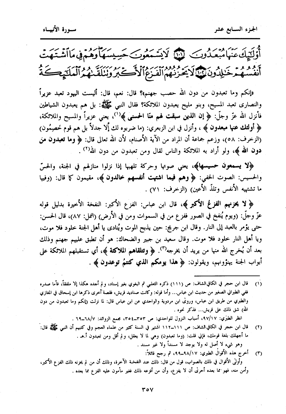 (1) قال ابن حجر في الكافي الشاف: ص (111) ذكره الثعلبي ثم البغوي بغير إسناد، ولم أجده هكذا إلا ملفقا، فأما صدره ففي الطبراني الصغير من حديث ابن عباس. . . وأما قوله: وكانت صناديد قريش، فقصة أخرى ذكرها ابن إسحاق في المغازي والطبراني من طريق ابن عباس، وروى ابن مردويه والواحدي عن ابن عباس قال: لما نزلت (إنكم وما تعبدون من دون الله) شق ذلك على قريش. . . فذكر نحوه. انظر الطبري: 17 / 97، أسباب النزول للواحدي: ص 353 - 354، مجمع الزوائد: 7 / 68 - 69.