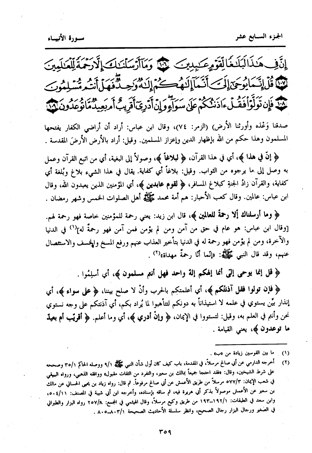 {إِنَّ فِي هَذَا لَبَلَاغًا لِقَوْمٍ عَابِدِينَ (106) وَمَا أَرْسَلْنَاكَ إِلَّا رَحْمَةً لِلْعَالَمِينَ (107) قُلْ إِنَّمَا يُوحَى إِلَيَّ أَنَّمَا إِلَهُكُمْ إِلَهٌ وَاحِدٌ فَهَلْ أَنْتُمْ مُسْلِمُونَ (108) فَإِنْ تَوَلَّوْا فَقُلْ آذَنْتُكُمْ عَلَى سَوَاءٍ وَإِنْ أَدْرِي أَقَرِيبٌ أَمْ بَعِيدٌ مَا تُوعَدُونَ (109) }