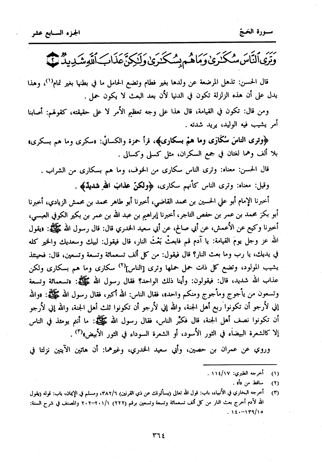 أَخْبَرَنَا الْإِمَامُ أَبُو عَلِيٍّ الْحُسَيْنُ بْنُ مُحَمَّدٍ الْقَاضِي، أَخْبَرَنَا أَبُو طَاهِرٍ مُحَمَّدُ بْنُ مَحْمَشٍ الزِّيَادَيُّ، أَخْبَرَنَا أَبُو بَكْرٍ مُحَمَّدُ بْنُ عُمَرَ بْنِ حَفْصٍ التَّاجِرُ، أَخْبَرَنَا إِبْرَاهِيمُ بْنُ عَبْدِ اللَّهِ بْنِ عُمَرَ بْنِ بُكَيْرٍ الْكُوفِيُّ الْعَبْسِيُّ، أَخْبَرَنَا وَكِيعٌ عَنِ الْأَعْمَشِ، عَنْ أَبِي صَالِحٍ، عَنْ أَبِي سَعِيدٍ الْخُدْرِيِّ قَالَ: قَالَ رَسُولُ اللَّهِ صَلَّى اللَّهُ عَلَيْهِ وَسَلَّمَ: "يَقُولُ اللَّهُ عَزَّ وَجَلَّ يَوْمَ الْقِيَامَةِ: يَا آدَمُ قُمْ فَابْعَثْ بَعْثَ النَّارِ، قَالَ فَيَقُولُ: لَبَّيْكَ وَسَعْدَيْكَ وَالْخَيْرُ كُلُّهُ فِي يَدَيْكَ، يَا رَبِّ وَمَا بَعْثُ النَّارِ؟ قَالَ فَيَقُولُ: مِنْ كُلِّ أَلِفٍ تِسْعَمِائَةٍ وَتِسْعَةً وَتِسْعِينَ، قَالَ: فَحِينَئِذٍ يَشِيبُ الْمَوْلُودُ، وَتَضَعُ كُلُّ ذَاتِ حَمْلٍ حَمْلَهَا وَتَرَى [النَّاسَ] (2) سُكَارَى وَمَا هُمْ بِسُكَارَى وَلَكِنَّ عَذَابَ اللَّهِ شَدِيدٌ، قَالَ: فَيَقُولُونَ: وَأَيُّنَا ذَاكَ الْوَاحِدُ؟ فَقَالَ رَسُولُ اللَّهِ صَلَّى اللَّهُ عَلَيْهِ وَسَلَّمَ: "تِسْعُمِائَةٍ وَتِسْعَةٌ وَتِسْعُونَ مِنْ يَأْجُوجَ وَمَأْجُوجَ وَمِنْكُمْ وَاحِدٌ"، فَقَالَ النَّاسُ: اللَّهُ أَكْبَرُ، فَقَالَ رَسُولُ اللَّهِ صَلَّى اللَّهُ عَلَيْهِ وَسَلَّمَ: "وَاللَّهِ إِنِّي لَأَرْجُو أَنْ تَكُونُوا رُبُعَ أَهْلِ الْجَنَّةِ، وَاللَّهِ إِنِّي لَأَرْجُو أَنْ تَكُونُوا ثُلُثَ أَهْلِ الْجَنَّةِ، وَاللَّهِ إِنِّي لَأَرْجُو أَنْ تَكُونُوا نِصْفَ أَهْلِ الْجَنَّةِ، قَالَ فَكَبَّرَ النَّاسُ، فَقَالَ رَسُولُ اللَّهِ صَلَّى اللَّهُ عَلَيْهِ وَسَلَّمَ: مَا أَنْتُمْ يَوْمَئِذٍ فِي النَّاسِ إِلَّا كَالشَّعْرَةِ الْبَيْضَاءِ فِي الثَّوْرِ الْأَسْوَدِ، أَوِ الشَّعْرَةِ السَّوْدَاءِ فِي الثَّوْرِ الْأَبْيَضِ" (3) .