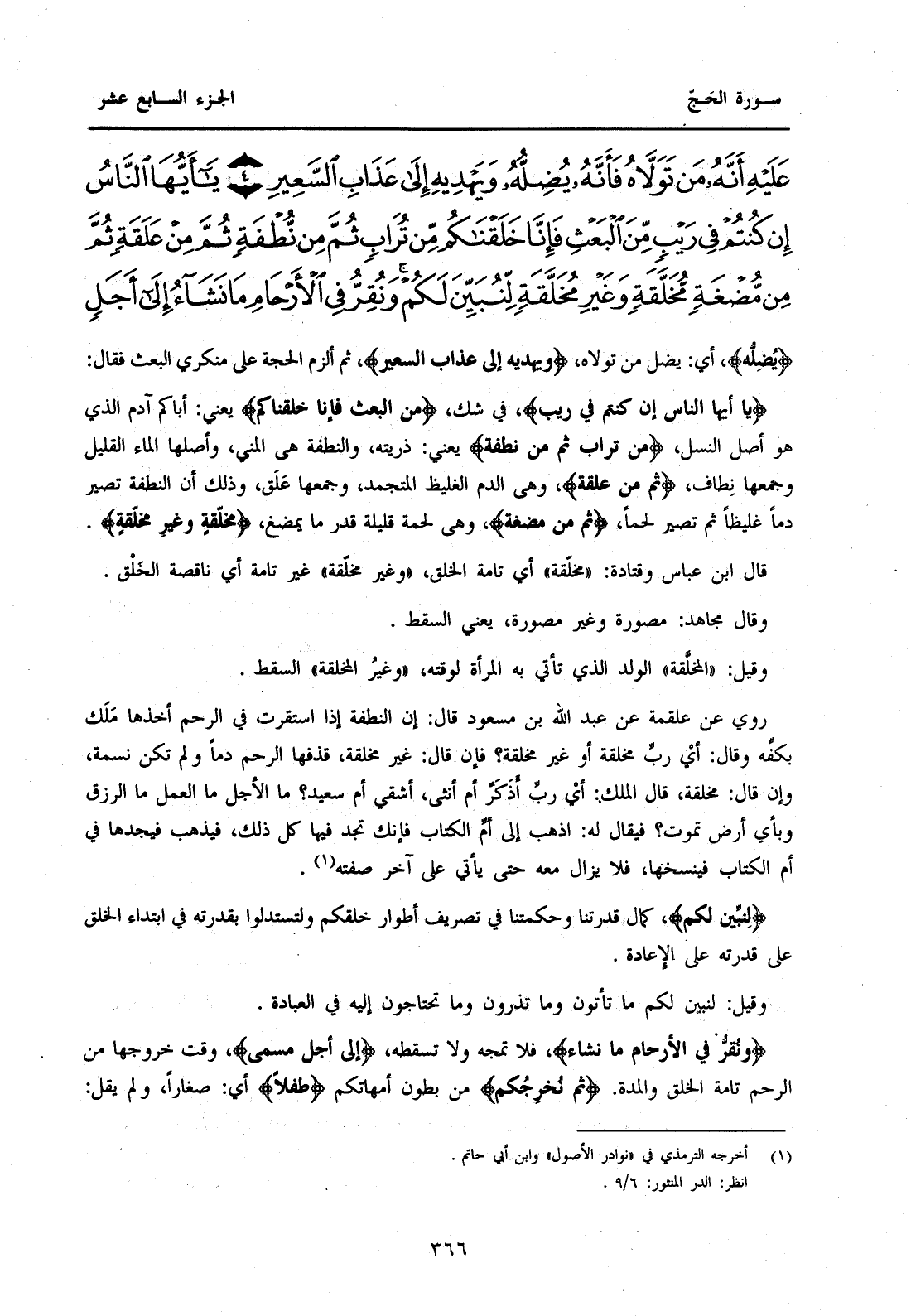 {يُضِلُّهُ} أَيْ: يَضِلُّ مَنْ تَوَلَّاهُ، {وَيَهْدِيهِ إِلَى عَذَابِ السَّعِيرِ} ثُمَّ أَلْزَمَ الْحُجَّةَ عَلَى مُنْكِرِي الْبَعْثِ فَقَالَ: {يَا أَيُّهَا النَّاسُ إِنْ كُنْتُمْ فِي رَيْبٍ} فِي شَكٍّ {مِنَ الْبَعْثِ فَإِنَّا خَلَقْنَاكُمْ} يَعْنِي: أَبَاكُمْ آدَمَ الَّذِي هُوَ أَصْلُ النَّسْلِ، {مِنْ تُرَابٍ ثُمَّ مِنْ نُطْفَةٍ} يَعْنِي: ذُرِّيَّتَهُ، وَالنُّطْفَةُ هِيَ الْمَنِيُّ، وَأَصْلُهَا الْمَاءُ الْقَلِيلُ وَجَمْعُهَا نِطَافٌ، {ثُمَّ مِنْ عَلَقَةٍ} وَهِيَ الدَّمُ الْغَلِيظُ الْمُتَجَمِّدُ، وَجَمْعُهَا عِلَقٌ، وَذَلِكَ أَنَّ النُّطْفَةَ تَصِيرُ دَمًا غَلِيظًا ثُمَّ تَصِيرُ لَحْمًا، {ثُمَّ مِنْ مُضْغَةٍ} وَهِيَ لَحْمَةٌ قَلِيلَةٌ قَدْرُ مَا يُمْضَغُ، {مُخَلَّقَةٍ وَغَيْرِ مُخَلَّقَةٍ}