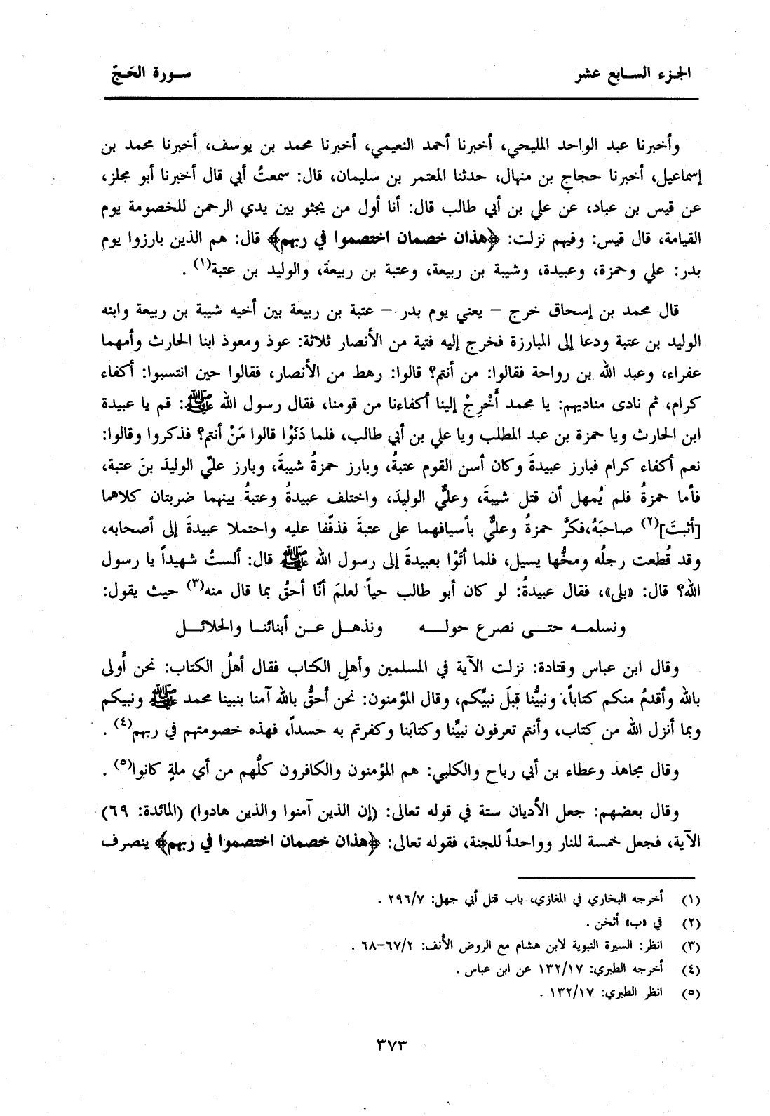 وَأَخْبَرَنَا عَبْدُ الْوَاحِدِ الْمَلِيحِيُّ، أَخْبَرَنَا أَحْمَدُ النُّعَيْمِيُّ، أَخْبَرَنَا مُحَمَّدُ بْنُ يُوسُفَ، أَخْبَرَنَا مُحَمَّدُ بْنُ إِسْمَاعِيلَ، أَخْبَرَنَا حَجَّاجُ بْنُ مِنْهَالٍ، حَدَّثَنَا الْمُعْتَمِرُ بْنُ سُلَيْمَانَ، قَالَ: سَمِعْتُ أَبِي قَالَ أَخْبَرَنَا أَبُو مِجْلَزٍ، عَنْ قَيْسِ بْنِ عَبَّادٍ، عَنْ عَلِيِّ بْنِ أَبِي طَالِبٍ قَالَ: أَنَا أَوَّلُ مَنْ يَجْثُو بَيْنَ يَدَيِ الرَّحْمَنِ لِلْخُصُومَةِ يَوْمَ الْقِيَامَةِ، قَالَ قَيْسٌ: وَفِيهِمْ نَزَلَتْ: {هَذَانَ خَصْمَانِ اخْتَصَمُوا فِي رَبِّهِمْ} قَالَ: هُمُ الَّذِينَ بَارَزُوا يَوْمَ بَدْرٍ: عَلِيٌّ وَحَمْزَةُ، وَعُبَيْدَةُ، وَشَيْبَةُ بْنُ رَبِيعَةَ، وَعُتْبَةُ بْنُ رَبِيعَةَ، وَالْوَلِيدُ بْنُ عُتْبَةَ (1) .