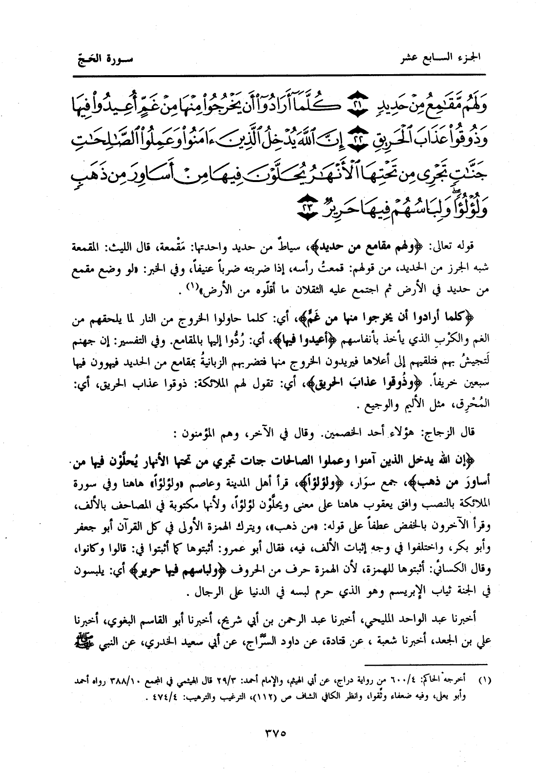 قَالَ الزَّجَّاجُ: هَؤُلَاءِ أَحَدُ الْخَصْمَيْنِ. وَقَالَ فِي الْآخَرِ، وَهُمُ الْمُؤْمِنُونَ: {إِنَّ اللَّهَ يُدْخِلُ الَّذِينَ آمَنُوا وَعَمِلُوا الصَّالِحَاتِ جَنَّاتٍ تَجْرِي مِنْ تَحْتِهَا الْأَنْهَارُ يُحَلَّوْنَ فِيهَا مِنْ أَسَاوِرَ مِنْ ذَهَبٍ} {إِنَّ اللَّهَ يُدْخِلُ الَّذِينَ آمَنُوا وَعَمِلُوا الصَّالِحَاتِ جَنَّاتٍ تَجْرِي مِنْ تَحْتِهَا الْأَنْهَارُ يُحَلَّوْنَ فِيهَا مِنْ أَسَاوِرَ مِنْ ذَهَبٍ} جَمْعُ سِوَارٍ، {وَلُؤْلُؤًا} قَرَأَ أَهْلُ الْمَدِينَةِ وَعَاصِمٌ "وَلُؤْلُؤًا" هَاهُنَا وَفِي سُورَةِ الْمَلَائِكَةِ بِالنَّصْبِ وَافَقَ يَعْقُوبُ هَاهُنَا عَلَى مَعْنَى وَيُحَلَّوْنَ لُؤْلُؤًا، وَلِأَنَّهَا مَكْتُوبَةٌ فِي الْمَصَاحِفِ بِالْأَلِفِ، وَقَرَأَ الْآخَرُونَ بِالْخَفْضِ عَطْفًا عَلَى قَوْلِهِ: "مِنْ ذَهَبٍ"، وَيَتْرُكُ الْهَمْزَةَ الْأُولَى فِي كُلِّ الْقُرْآنِ أَبُو جَعْفَرٍ وَأَبُو بَكْرٍ، وَاخْتَلَفُوا فِي وَجْهِ إِثْبَاتِ الْأَلِفِ، فِيهِ، فَقَالَ أَبُو عَمْرٍو: أَثْبَتُوهَا كَمَا أَثْبَتُوا فِي: قَالُوا وَكَانُوا، وَقَالَ الْكِسَائِيُّ: أَثْبَتُوهَا لِلْهَمْزَةِ، لِأَنَّ الْهَمْزَةَ حَرْفٌ مِنَ الْحُرُوفِ {وَلِبَاسُهُمْ فِيهَا حَرِيرٌ} أَيْ: يَلْبَسُونَ فِي الْجَنَّةِ ثِيَابَ الْإِبْرَيْسَمِ وَهُوَ الَّذِي حَرُمَ لَبْسُهُ فِي الدُّنْيَا عَلَى الرِّجَالِ.