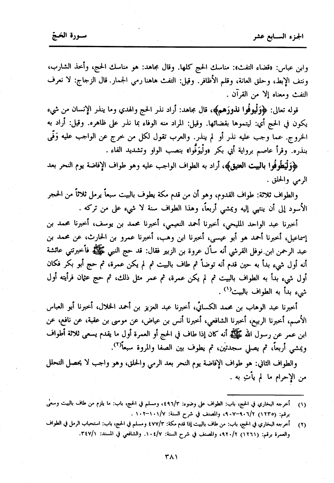 قَوْلُهُ تَعَالَى: {وَلْيُوفُوا نُذُورَهُمْ} قَالَ مُجَاهِدٌ: أَرَادَ نَذْرَ الْحَجِّ وَالْهَدْيِ وَمَا يُنْذِرُ الْإِنْسَانُ مِنْ شَيْءٍ يَكُونُ فِي الْحَجِّ أَيْ: لِيُتِمُّوهَا بِقَضَائِهَا. وَقِيلَ: الْمُرَادُ مِنْهُ الْوَفَاءُ بِمَا نَذَرَ عَلَى ظَاهِرِهِ. وَقِيلَ: أَرَادَ بِهِ الْخُرُوجَ. عَمَّا وَجَبَ عَلَيْهِ نَذَرَ أَوْ لَمْ يَنْذِرْ. وَالْعَرَبُ تَقُولُ لِكُلِّ مَنْ خَرَجَ عَنِ الْوَاجِبِ عَلَيْهِ وَفَّى بِنَذْرِهِ. وَقَرَأَ عَاصِمٌ بِرِوَايَةِ أَبِي بَكْرٍ "وَلِيُوَفُّوا" بِنَصْبِ الْوَاوِ وَتَشْدِيدِ الْفَاءِ.