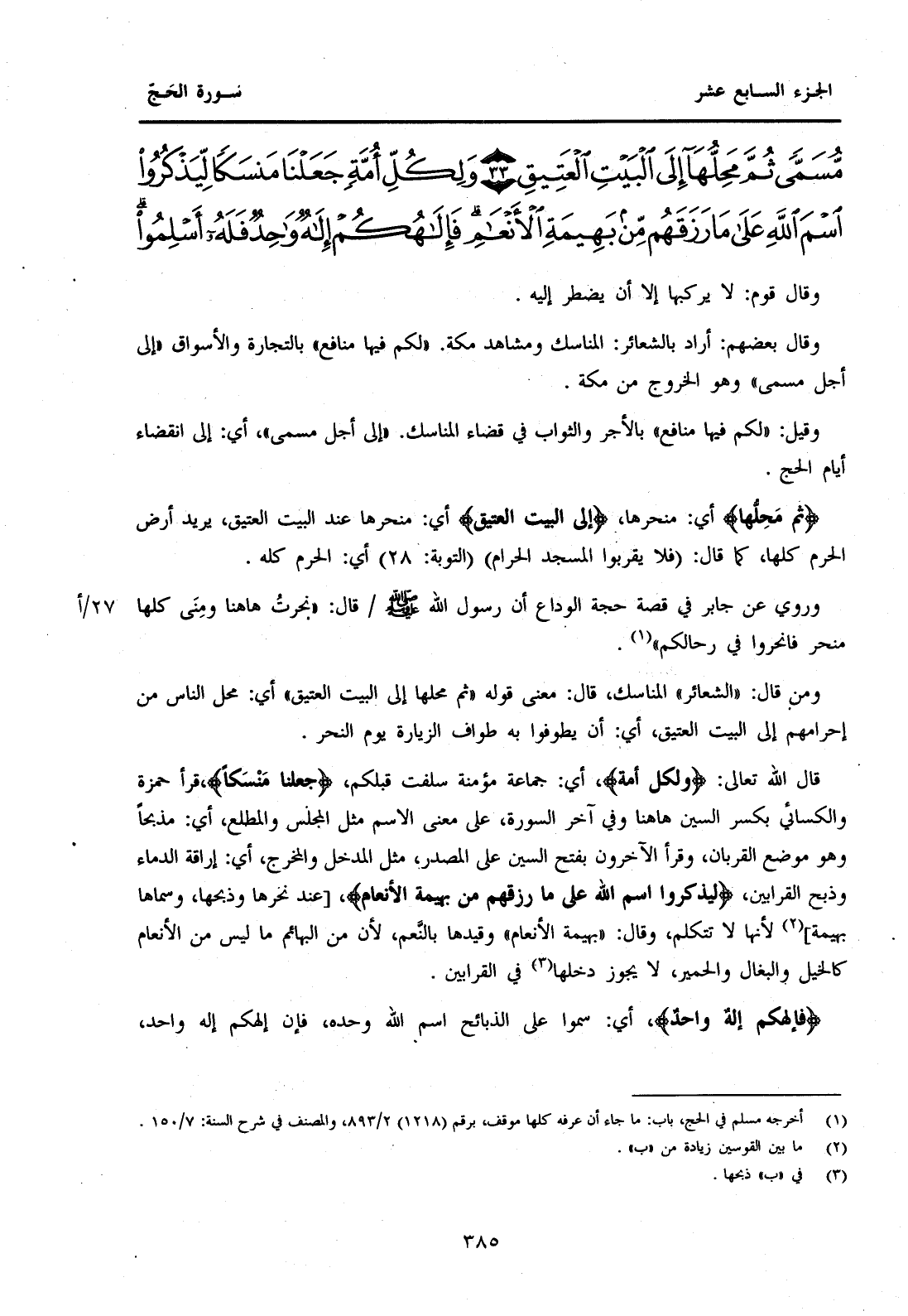 قَالَ اللَّهُ تَعَالَى: {وَلِكُلِّ أُمَّةٍ} أَيْ: جَمَاعَةٍ مُؤْمِنَةٍ سَلَفَتْ قَبْلَكُمْ، {جَعَلْنَا مَنْسَكًا} قَرَأَ حَمْزَةُ وَالْكِسَائِيُّ بِكَسْرِ السِّينِ هَاهُنَا وَفِي آخِرِ السُّورَةِ، عَلَى مَعْنَى الِاسْمِ مِثْلَ الْمَسْجِدِ وَالْمَطْلِعِ، أَيْ: مَذْبَحًا وَهُوَ مَوْضِعُ الْقُرْبَانِ، وَقَرَأَ الْآخَرُونَ بِفَتْحِ السِّينِ عَلَى الْمَصْدَرِ، مِثْلَ الْمَدْخَلِ وَالْمَخْرَجِ، أَيْ: إِرَاقَةُ الدِّمَاءِ وَذَبْحُ الْقَرَابِينَ، {لِيَذْكُرُوا اسْمَ اللَّهِ عَلَى مَا رَزَقَهُمْ مِنْ بَهِيمَةِ الْأَنْعَامِ} [عِنْدَ نَحْرِهَا وَذَبْحِهَا، وَسَمَّاهَا بَهِيمَةً] (2) لِأَنَّهَا لَا تَتَكَلَّمُ، وَقَالَ: "بَهِيمَةِ الْأَنْعَامِ" وَقَيَّدَهَا بِالنَّعَمِ، لِأَنَّ مِنَ الْبَهَائِمِ مَا لَيْسَ مِنَ الْأَنْعَامِ كَالْخَيْلِ وَالْبِغَالِ وَالْحَمِيرِ، لَا يَجُوزُ دَخْلُهَا (3) فِي الْقَرَابِينَ.