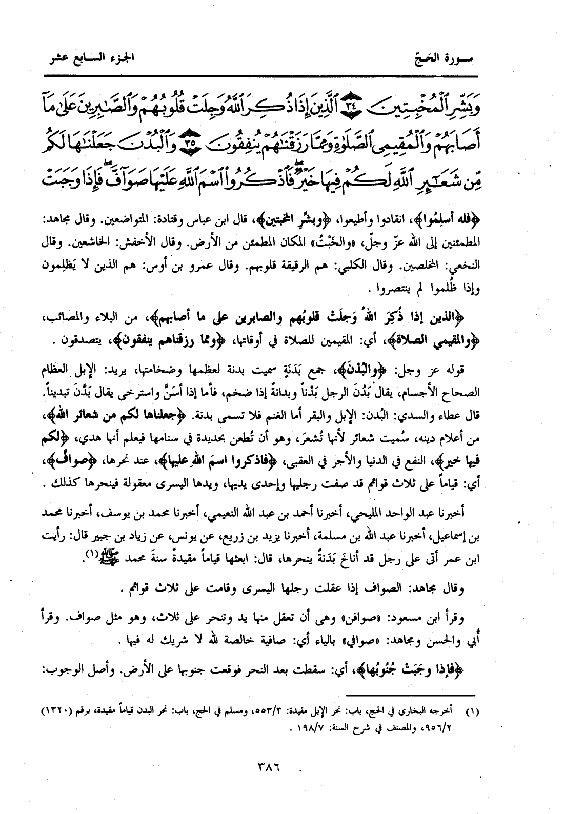 {الَّذِينَ إِذَا ذُكِرَ اللَّهُ وَجِلَتْ قُلُوبُهُمْ وَالصَّابِرِينَ عَلَى مَا أَصَابَهُمْ} مِنَ الْبَلَاءِ وَالْمَصَائِبِ {وَالْمُقِيمِي الصَّلَاةِ} أَيِ: الْمُقِيمِينَ لِلصَّلَاةِ فِي أَوْقَاتِهَا، {وَمِمَّا رَزَقْنَاهُمْ يُنْفِقُونَ} يَتَصَدَّقُونَ. قَوْلُهُ عَزَّ وَجَلَّ: {وَالْبُدْنَ} جَمْعُ بَدَنَةٍ سُمِّيَتْ بَدَنَةً لِعِظَمِهَا وَضَخَامَتِهَا، يُرِيدُ: الْإِبِلَ الْعِظَامَ الصِّحَاحَ الْأَجْسَامِ، يُقَالُ بَدَنَ الرَّجُلُ بُدْنًا وَبَدَانَةً إِذَا ضَخُمَ، فَأَمَّا إِذَا أَسَنَّ وَاسْتَرْخَى يُقَالُ بَدَنَ تَبْدِينًا. قَالَ عَطَاءٌ وَالسُّدِّيُّ: الْبُدْنُ: الْإِبِلُ وَالْبَقَرُ أَمَّا الْغَنَمُ فَلَا تُسَمَّى بَدَنَةً. {جَعَلْنَاهَا لَكُمْ مِنْ شَعَائِرِ اللَّهِ} مِنْ أَعْلَامِ دِينِهِ، سُمِّيَتْ شَعَائِرَ لِأَنَّهَا تُشْعِرُ، وَهُوَ أَنْ تُطْعَنَ بِحَدِيدَةٍ فِي سَنَامِهَا فَيُعْلَمَ أَنَّهَا هَدْيٌ، {لَكُمْ فِيهَا خَيْرٌ} النَّفْعُ فِي الدُّنْيَا وَالْأَجْرُ فِي الْعُقْبَى، {فَاذْكُرُوا اسْمَ اللَّهِ عَلَيْهَا} عِنْدَ نَحْرِهَا، {صَوَافَّ} أَيْ: قِيَامًا عَلَى ثَلَاثِ قَوَائِمَ قَدْ صَفَّتْ رِجْلَيْهَا وَإِحْدَى يَدَيْهَا، وَيَدُهَا الْيُسْرَى مَعْقُولَةٌ فَيَنْحَرُهَا كَذَلِكَ.