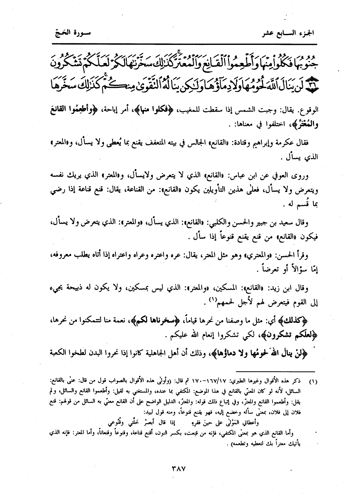 (1) ذكر هذه الأقوال وغيرها الطبري: 17 / 167 - 170 ثم قال: (وأولى هذه الأقوال بالصواب قول من قال: عنى بالقانع: السائل، لأنه لو كان المعني بالقانع في هذا الموضع: المكتفي بما عنده، والمستغني به لقيل: وأطعموا القانع والسائل، ولم يقل: وأطعموا القانع والمعتر، وفي إتباع ذلك قوله: والمعتر، الدليل الواضح على أن القانع معني به السائل من قولهم: قنع فلان إلى فلان، بمعنى سأله وخضع إليه، فهو يقنع قنوعا، ومنه قول لبيد: وأعطاني المولى على حين فقره ... بنات إذا قال أبصر خلتي وقنوعي