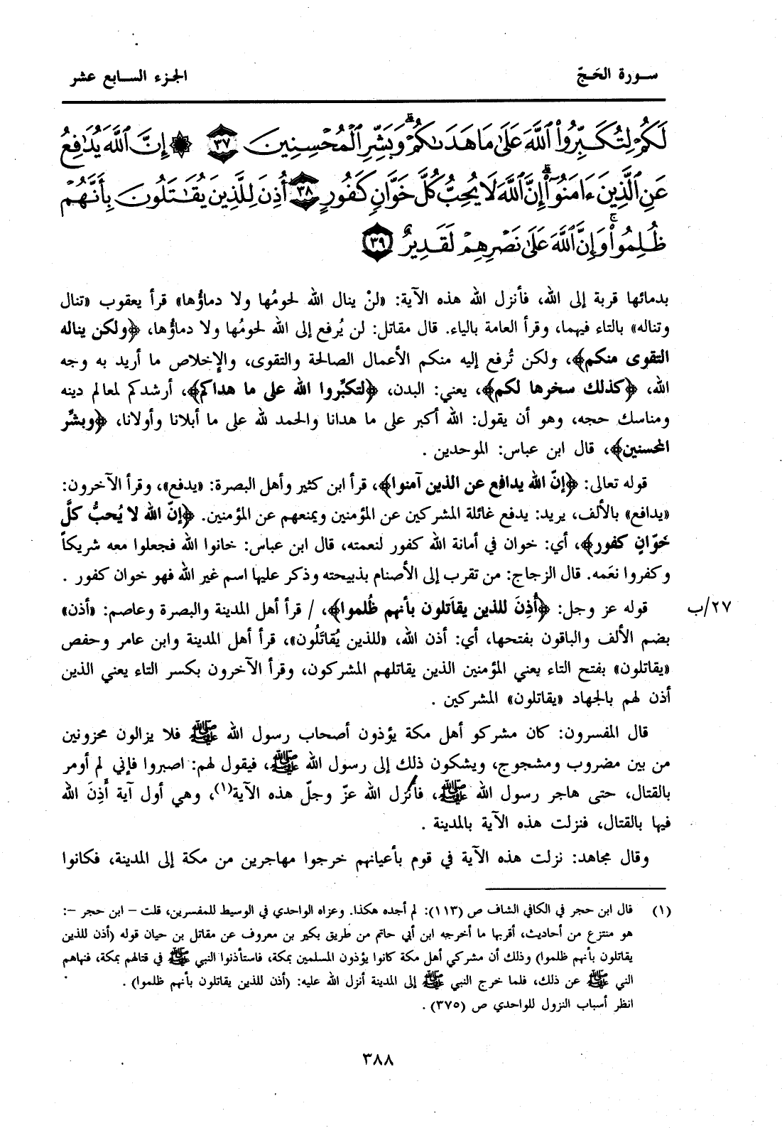 قَوْلُهُ تَعَالَى: {إِنَّ اللَّهَ يُدَافِعُ عَنِ الَّذِينَ آمَنُوا} قَرَأَ ابْنُ كَثِيرٍ وَأَهْلُ الْبَصْرَةِ: "يَدْفَعُ"، وَقَرَأَ الْآخَرُونَ: "يُدَافِعُ" بِالْأَلِفِ، يُرِيدُ: يَدْفَعُ غَائِلَةَ الْمُشْرِكِينَ عَنِ الْمُؤْمِنِينَ وَيَمْنَعُهُمْ عَنِ الْمُؤْمِنِينَ. {إِنَّ اللَّهَ لَا يُحِبُّ كُلَّ خَوَّانٍ كَفُورٍ} أَيْ: خَوَّانٍ فِي أَمَانَةِ اللَّهِ كَفُورٍ لِنِعْمَتِهِ، قَالَ ابْنُ عَبَّاسٍ: خَانُوا اللَّهَ فَجَعَلُوا مَعَهُ شَرِيكًا وَكَفَرُوا نِعَمَهُ. قَالَ الزَّجَّاجُ: مَنْ تَقَرَّبَ إِلَى الْأَصْنَامِ بِذَبِيحَتِهِ وذكر عليها اسم غَيْرَ اللَّهِ فَهُوَ خَوَّانٌ كَفُورٌ. قَوْلُهُ عَزَّ وَجَلَّ: {أُذِنَ لِلَّذِينَ يُقَاتَلُونَ بِأَنَّهُمْ ظُلِمُوا} 27/ب قَرَأَ أَهْلُ الْمَدِينَةِ وَالْبَصْرَةِ وَعَاصِمٌ: "أُذِنَ" بِضَمِّ الْأَلِفِ وَالْبَاقُونَ بِفَتْحِهَا، أَيْ: أَذِنَ اللَّهُ، "لِلَّذِينِ يُقَاتِلُونَ"، قَرَأَ أَهْلُ الْمَدِينَةِ وَابْنُ عَامِرٍ وَحَفْصٌ "يُقَاتَلُونَ" بِفَتْحِ التَّاءِ يَعْنِي الْمُؤْمِنِينَ الَّذِينَ يُقَاتِلُهُمُ الْمُشْرِكُونَ، وَقَرَأَ الْآخَرُونَ بِكَسْرِ التَّاءِ يَعْنِي الَّذِينَ أُذِنَ لَهُمْ بِالْجِهَادِ "يُقَاتِلُونَ" الْمُشْرِكِينَ.