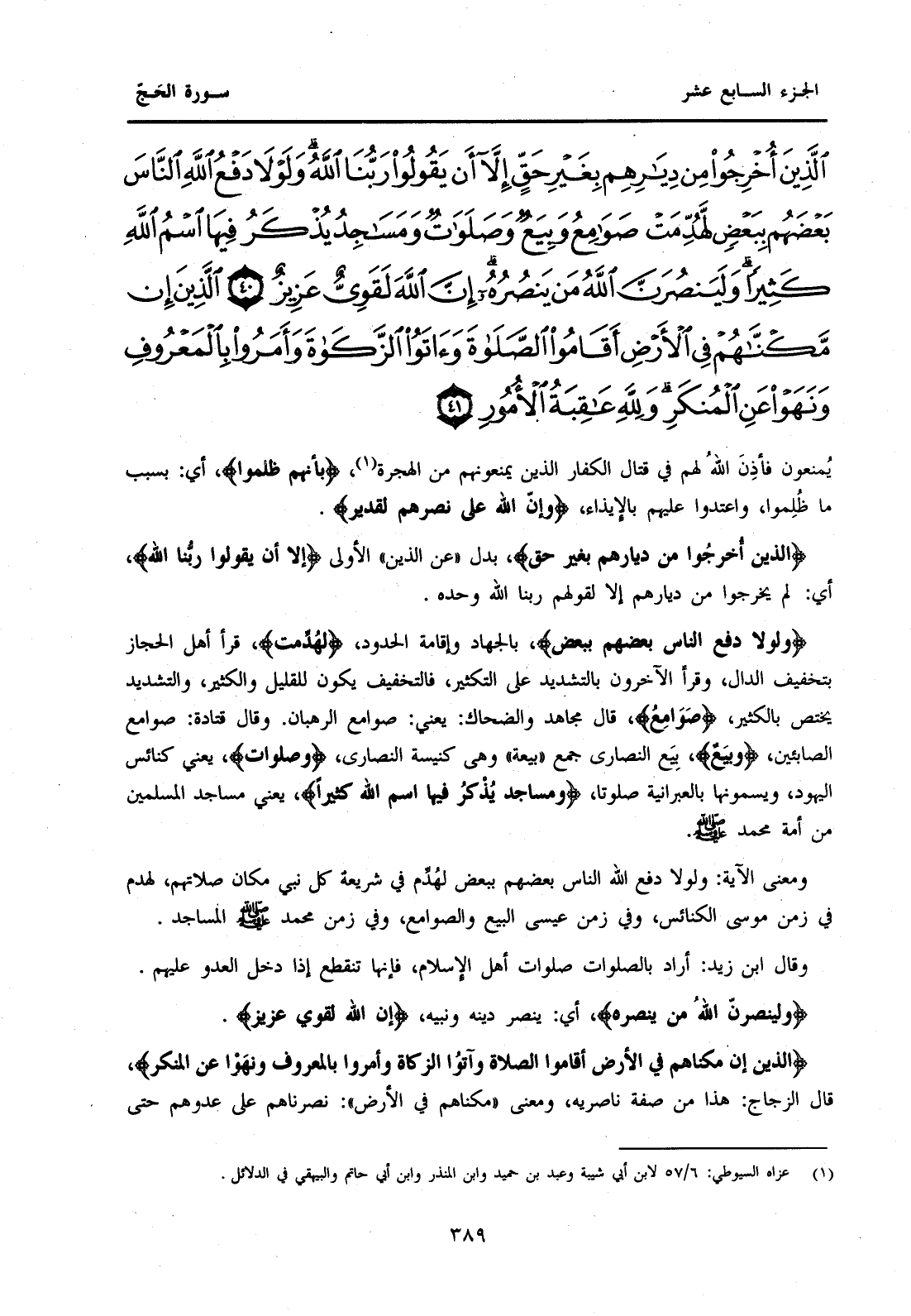 {الَّذِينَ أُخْرِجُوا مِنْ دِيَارِهِمْ بِغَيْرِ حَقٍّ إِلَّا أَنْ يَقُولُوا رَبُّنَا اللَّهُ وَلَوْلَا دَفْعُ اللَّهِ النَّاسَ بَعْضَهُمْ بِبَعْضٍ لَهُدِّمَتْ صَوَامِعُ وَبِيَعٌ وَصَلَوَاتٌ وَمَسَاجِدُ يُذْكَرُ فِيهَا اسْمُ اللَّهِ كَثِيرًا وَلَيَنْصُرَنَّ اللَّهُ مَنْ يَنْصُرُهُ إِنَّ اللَّهَ لَقَوِيٌّ عَزِيزٌ (40) الَّذِينَ إِنْ مَكَّنَّاهُمْ فِي الْأَرْضِ أَقَامُوا الصَّلَاةَ وَآتَوُا الزَّكَاةَ وَأَمَرُوا بِالْمَعْرُوفِ وَنَهَوْا عَنِ الْمُنْكَرِ وَلِلَّهِ عَاقِبَةُ الْأُمُورِ (41) }