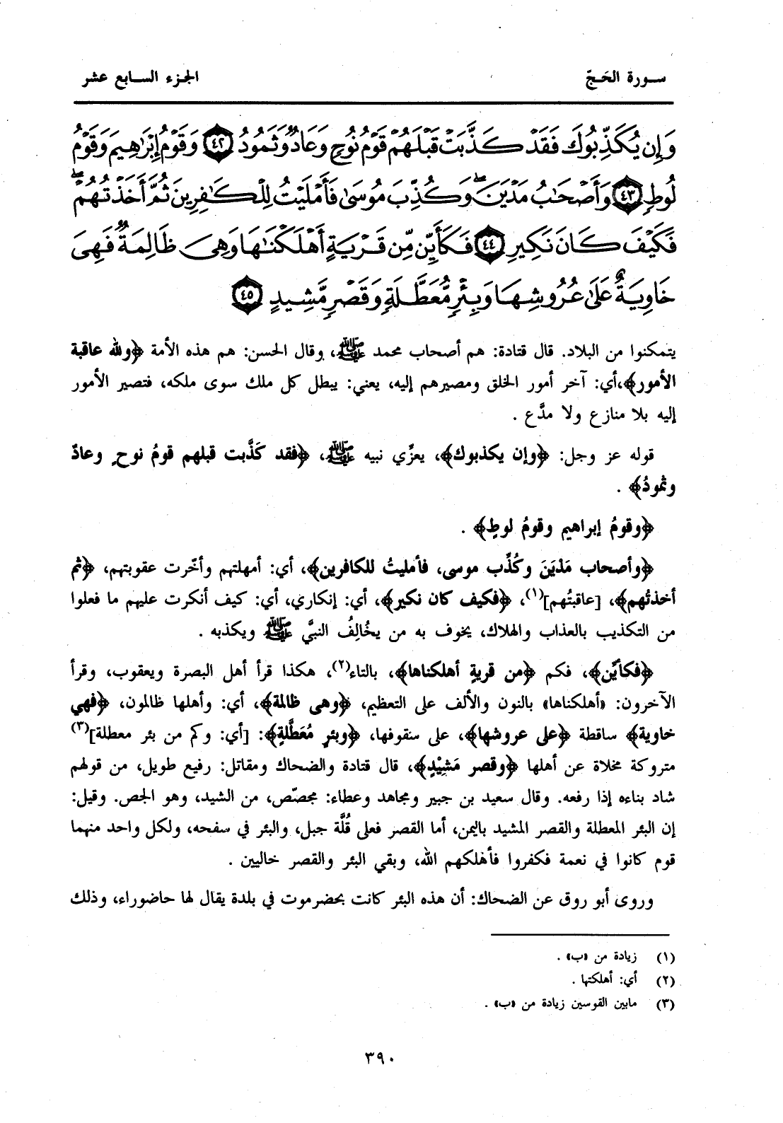 قَوْلُهُ عَزَّ وَجَلَّ: {وَإِنْ يُكَذِّبُوكَ} يُعَزِّي نَبِيَّهُ صَلَّى اللَّهُ عَلَيْهِ وَسَلَّمَ، {فَقَدْ كَذَّبَتْ قَبْلَهُمْ قَوْمُ نُوحٍ وَعَادٌ وَثَمُودُ} {وَقَوْمُ إِبْرَاهِيمَ وَقَوْمُ لُوطٍ} . {وَأَصْحَابُ مَدْيَنَ وَكُذِّبَ مُوسَى فَأَمْلَيْتُ لِلْكَافِرِينَ} أَيْ: أَمْهَلْتُهُمْ وَأَخَّرْتُ عُقُوبَتَهُمْ، {ثُمَّ أَخَذْتُهُمْ} [عَاقَبْتُهُمْ] (1) {فَكَيْفَ كَانَ نَكِيرِ} أَيْ: إِنْكَارِي، أَيْ: كَيْفَ أَنْكَرْتُ عَلَيْهِمْ مَا فَعَلُوا مِنَ التَّكْذِيبِ بِالْعَذَابِ وَالْهَلَاكِ، يُخَوِّفُ بِهِ مَنْ يُخَالِفُ النَّبِيَّ صَلَّى اللَّهُ عَلَيْهِ وَسَلَّمَ وَيُكَذِّبُهُ. {فَكَأَيِّنْ} فَكَمْ {مِنْ قَرْيَةٍ أَهْلَكْنَاهَا} بِالتَّاءِ (2) هَكَذَا قَرَأَ أَهْلُ الْبَصْرَةِ وَيَعْقُوبُ، وَقَرَأَ الْآخَرُونَ: "أَهْلَكْنَاهَا" بِالنُّونِ وَالْأَلِفِ عَلَى التَّعْظِيمِ، {وَهِيَ ظَالِمَةٌ} أَيْ: وَأَهْلُهَا ظَالِمُونَ، {فَهِيَ خَاوِيَةٌ} سَاقِطَةٌ {عَلَى عُرُوشِهَا} عَلَى سُقُوفِهَا، {وَبِئْرٍ مُعَطَّلَةٍ} [أَيْ: وَكَمْ مِنْ بِئْرٍ مُعَطَّلَةٍ] (3) مَتْرُوكَةٍ مُخْلَاةٍ عَنْ أَهْلِهَا {وَقَصْرٍ مَشِيدٍ} قَالَ قَتَادَةُ وَالضَّحَّاكُ وَمُقَاتِلٌ: رَفِيعٌ طَوِيلٌ، مِنْ قَوْلِهِمْ شَادَ بِنَاءَهُ إِذَا رَفَعَهُ. وَقَالَ سَعِيدُ بْنُ جُبَيْرٍ وَمُجَاهِدٌ وَعَطَاءٌ: مُجَصَّصٌ، مِنَ الشَّيْدِ، وَهُوَ الْجِصُّ. وَقِيلَ: إِنَّ الْبِئْرَ الْمُعَطَّلَةَ وَالْقَصْرَ الْمَشِيدَ بِالْيَمَنِ، أَمَّا الْقَصْرُ فَعَلَى قُلَّةِ جَبَلٍ، وَالْبِئْرُ فِي سَفْحِهِ، وَلِكُلِّ وَاحِدٍ مِنْهُمَا قَوْمٌ كَانُوا فِي نِعْمَةٍ فَكَفَرُوا فَأَهْلَكَهُمُ اللَّهُ، وَبَقِيَ الْبِئْرُ وَالْقَصْرُ خَالِيَيْنِ.