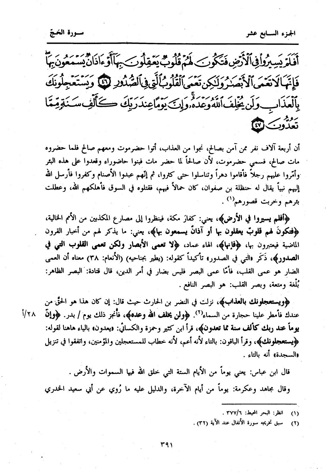 {أَفَلَمْ يَسِيرُوا فِي الْأَرْضِ} يَعْنِي: كَفَّارَ مَكَّةَ، فَيَنْظُرُوا إِلَى مَصَارِعِ الْمُكَذِّبِينَ مِنَ الْأُمَمِ الْخَالِيَةِ، {فَتَكُونَ لَهُمْ قُلُوبٌ يَعْقِلُونَ بِهَا أَوْ آذَانٌ يَسْمَعُونَ بِهَا} يَعْنِي: مَا يُذْكَرُ لَهُمْ مِنْ أَخْبَارِ الْقُرُونِ الْمَاضِيَةِ فَيَعْتَبِرُونَ بِهَا، {فَإِنَّهَا} الْهَاءُ عِمَادٌ، {لَا تَعْمَى الْأَبْصَارُ وَلَكِنْ تَعْمَى الْقُلُوبُ الَّتِي فِي الصُّدُورِ} ذَكَرَ "الَّتِي فِي الصُّدُورِ" تَأْكِيدًا كَقَوْلِهِ: {يَطِيرُ بِجَنَاحَيْهِ} (الْأَنْعَامِ: 38) مَعْنَاهُ أَنَّ الْعَمَى الضَّارَّ هُوَ عَمَى الْقَلْبِ، فَأَمَّا عَمَى الْبَصَرِ فَلَيْسَ بِضَارٍّ فِي أَمْرِ الدِّينِ، قَالَ قَتَادَةُ: الْبَصَرُ الظَّاهِرُ: بُلْغةٌ وَمُتْعَةٌ، وَبَصَرُ الْقَلْبِ: هُوَ الْبَصَرُ النَّافِعُ. {وَيَسْتَعْجِلُونَكَ بِالْعَذَابِ} نَزَلَتْ فِي النَّضْرِ بْنِ الْحَارِثِ حَيْثُ قَالَ: إِنْ كَانَ هَذَا هُوَ الْحَقَّ مِنْ عِنْدِكَ فَأَمْطِرَ عَلَيْنَا حِجَارَةً مِنَ السَّمَاءِ (1) {وَلَنْ يُخْلِفَ اللَّهُ وَعْدَهُ} فَأَنْجَزَ ذلك يوم 28/أبَدْرٍ. {وَإِنَّ يَوْمًا عِنْدَ رَبِّكَ كَأَلْفِ سَنَةٍ مِمَّا تَعُدُّونَ} قَرَأَ ابْنُ كَثِيرٍ وَحَمْزَةُ وَالْكِسَائِيُّ: "يَعُدُّونَ" بِالْيَاءِ هَاهُنَا لِقَوْلِهِ: {وَيَسْتَعْجِلُونَكَ} وَقَرَأَ الْبَاقُونَ: بِالتَّاءِ لِأَنَّهُ أَعَمُّ، لِأَنَّهُ خِطَابٌ لِلْمُسْتَعْجِلِينَ وَالْمُؤْمِنِينَ، وَاتَّفَقُوا فِي تَنْزِيلِ "السَّجْدَةِ" أَنَّهُ بِالتَّاءِ.