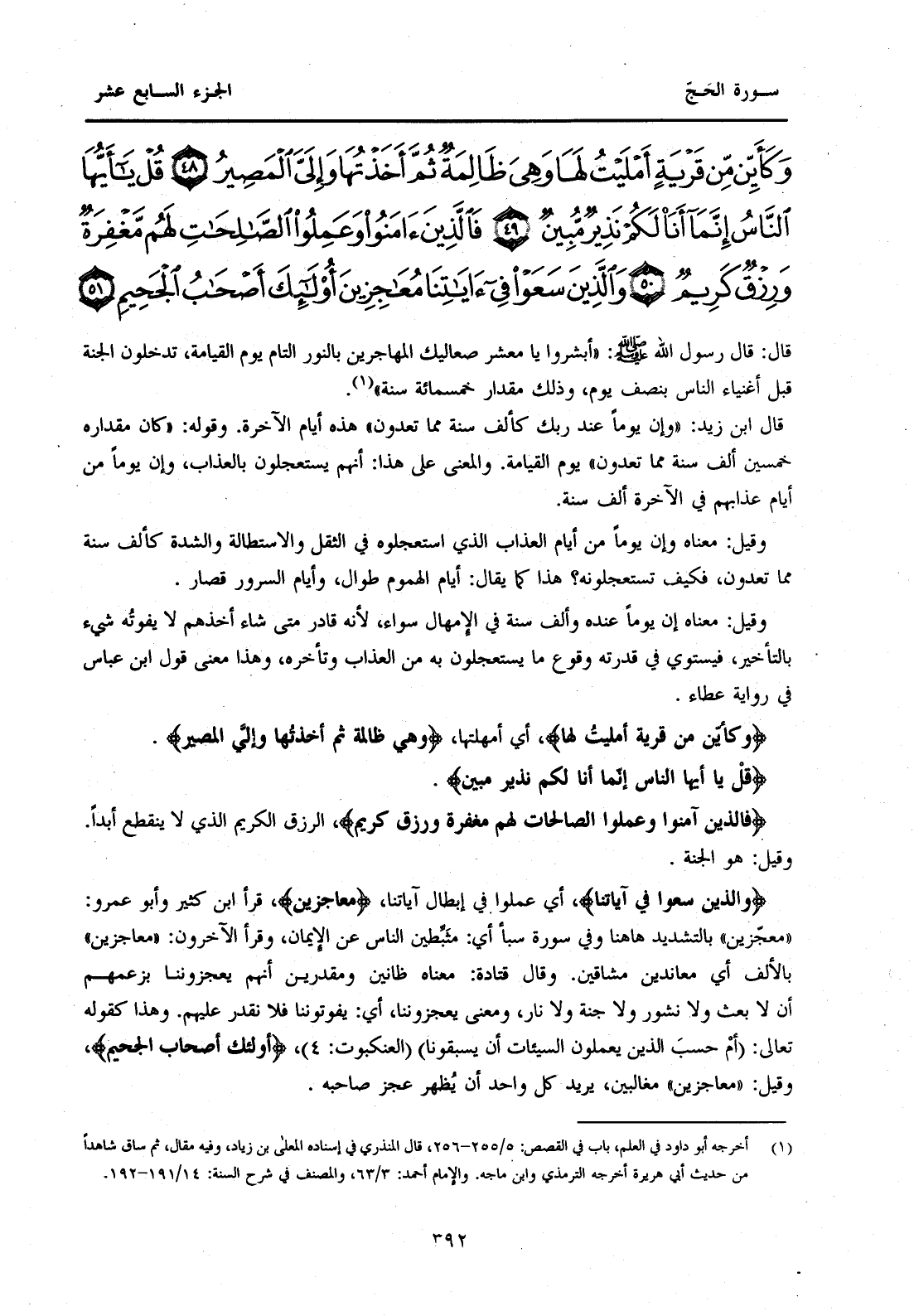 {وَكَأَيِّنْ مِنْ قَرْيَةٍ أَمْلَيْتُ لَهَا} أَيْ أَمْهَلْتُهَا، {وَهِيَ ظَالِمَةٌ ثُمَّ أَخَذْتُهَا وَإِلَيَّ الْمَصِيرُ} . {قُلْ يَا أَيُّهَا النَّاسُ إِنَّمَا أَنَا لَكُمْ نَذِيرٌ مُبِينٌ} . {فَالَّذِينَ آمَنُوا وَعَمِلُوا الصَّالِحَاتِ لَهُمْ مَغْفِرَةٌ وَرِزْقٌ كَرِيمٌ} الرِّزْقُ الْكَرِيمُ الَّذِي لَا يَنْقَطِعُ أَبَدًا. وَقِيلَ: هُوَ الْجَنَّةُ. {وَالَّذِينَ سَعَوْا فِي آيَاتِنَا} أَيْ عَمِلُوا فِي إِبْطَالِ آيَاتِنَا، {مُعَاجِزِينَ} قَرَأَ ابْنُ كَثِيرٍ وَأَبُو عَمْرٍو: "مُعَجِّزَيْنِ" بِالتَّشْدِيدِ هَاهُنَا وَفِي سُورَةِ سَبَإٍ أَيْ: مُثَبِّطِينَ النَّاسَ عَنِ الْإِيمَانِ، وَقَرَأَ الآخرون: "معاجزين" بالأف أَيْ مُعَانِدِينَ مُشَاقِّينَ. وَقَالَ قَتَادَةُ: مَعْنَاهُ ظَانِّينَ وَمُقَدِّرِينَ أَنَّهُمْ يُعْجِزُونَنَا بِزَعْمِهِمْ أَنْ لَا بَعْثَ وَلَا نُشُورَ وَلَا جَنَّةَ وَلَا نَارَ، وَمَعْنَى يُعْجِزُونَنَا، أَيْ: يَفُوتُونَنَا فَلَا نَقْدِرُ عَلَيْهِمْ. وَهَذَا كَقَوْلِهِ تَعَالَى: {أَمْ حَسِبَ الَّذِينَ يَعْمَلُونَ السَّيِّئَاتِ أَنْ يَسْبِقُونَا} (الْعَنْكَبُوتِ: 4) ، {أُولَئِكَ أَصْحَابُ الْجَحِيمِ} وَقِيلَ: "مُعَاجِزِينَ" مُغَالِبِينَ، يُرِيدُ كُلُّ وَاحِدٍ أَنْ يُظْهِرَ عَجْزَ صَاحِبِهِ.