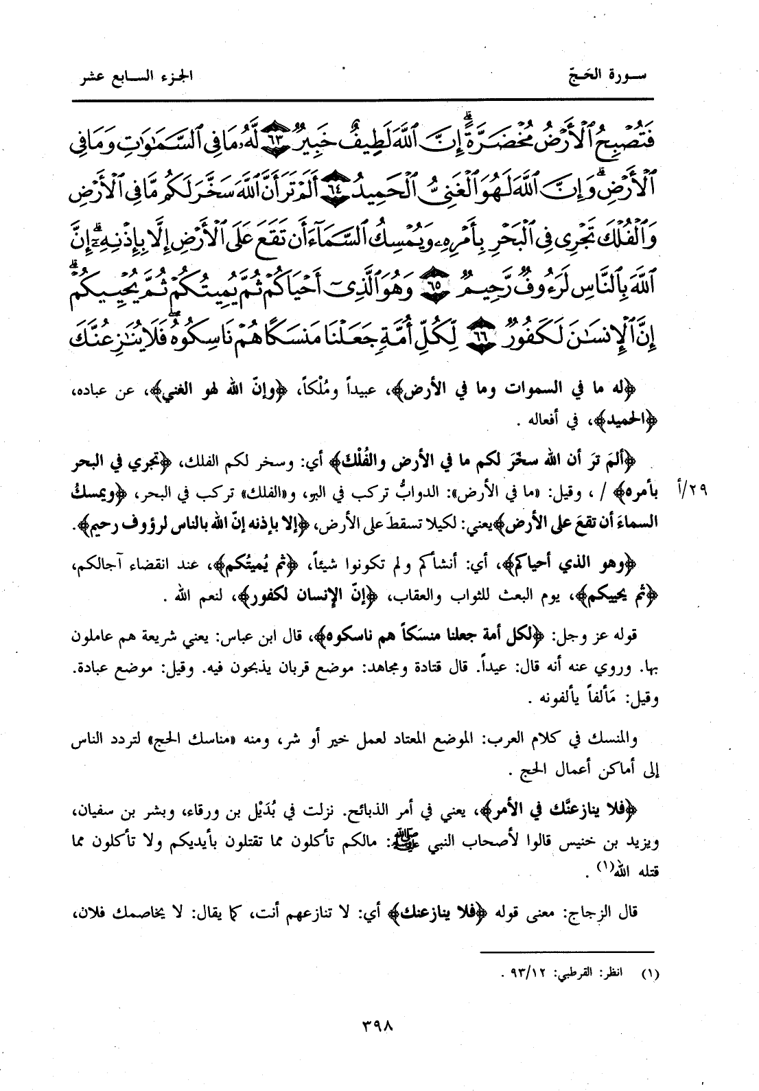 {لَهُ مَا فِي السَّمَاوَاتِ وَمَا فِي الْأَرْضِ} عَبِيدًا وَمُلْكًا، {وَإِنَّ اللَّهَ لَهُوَ الْغَنِيُّ} عَنْ عِبَادِهِ، {الْحَمِيدُ} فِي أَفْعَالِهِ. {أَلَمْ تَرَ أَنَّ اللَّهَ سَخَّرَ لَكُمْ مَا فِي الْأَرْضِ وَالْفُلْكَ} أَيْ: وَسَخَّرَ لَكُمُ الْفَلْكَ، {تَجْرِي فِي الْبَحْرِ بِأَمْرِهِ} 29/أوَقِيلَ: "مَا فِي الْأَرْضِ": الدَّوَابُّ تُرْكَبُ فِي الْبَرِّ، وَ"الْفُلْكُ" تُرْكَبُ فِي الْبَحْرِ، {وَيُمْسِكُ السَّمَاءَ أَنْ تَقَعَ عَلَى الْأَرْضِ} يَعْنِي: لِكَيْلَا تَسْقُطَ عَلَى الْأَرْضِ، {إِلَّا بِإِذْنِهِ إِنَّ اللَّهَ بِالنَّاسِ لَرَءُوفٌ رَحِيمٌ} {وَهُوَ الَّذِي أَحْيَاكُمْ} أَيْ: أَنْشَأَكُمْ وَلَمْ تَكُونُوا شَيْئًا، {ثُمَّ يُمِيتُكُمْ} عِنْدَ انْقِضَاءِ آجَالِكُمْ، {ثُمَّ يُحْيِيكُمْ} يَوْمَ الْبَعْثِ لِلثَّوَابِ وَالْعِقَابِ، {إِنَّ الْإِنْسَانَ لَكَفُورٌ} لِنِعَمِ اللَّهِ. قَوْلُهُ عَزَّ وَجَلَّ: {لِكُلِّ أُمَّةٍ جَعَلْنَا مَنْسَكًا هُمْ نَاسِكُوهُ} قَالَ ابْنُ عَبَّاسٍ: يَعْنِي شَرِيعَةً هُمْ عَامِلُونَ بِهَا. وَرُوِيَ عَنْهُ أَنَّهُ قَالَ: عِيدًا قَالَ قَتَادَةُ وَمُجَاهِدٌ: مَوْضِعَ قُرْبَانٍ يَذْبَحُونَ فِيهِ. وَقِيلَ: مَوْضِعَ عِبَادَةٍ. وَقِيلَ: مَأْلَفًا يَأْلَفُونَهُ.