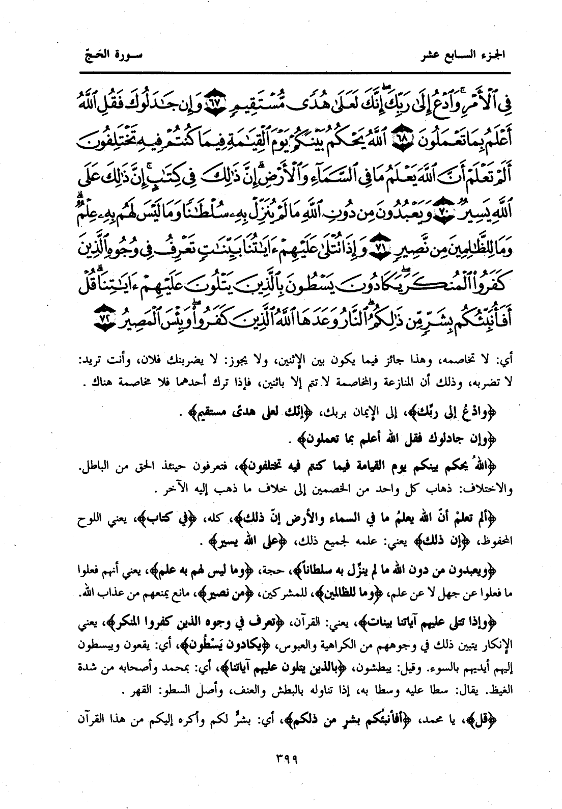 {وَإِنْ جَادَلُوكَ فَقُلِ اللَّهُ أَعْلَمُ بِمَا تَعْمَلُونَ (68) اللَّهُ يَحْكُمُ بَيْنَكُمْ يَوْمَ الْقِيَامَةِ فِيمَا كُنْتُمْ فِيهِ تَخْتَلِفُونَ (69) أَلَمْ تَعْلَمْ أَنَّ اللَّهَ يَعْلَمُ مَا فِي السَّمَاءِ وَالْأَرْضِ إِنَّ ذَلِكَ فِي كِتَابٍ إِنَّ ذَلِكَ عَلَى اللَّهِ يَسِيرٌ (70) وَيَعْبُدُونَ مِنْ دُونِ اللَّهِ مَا لَمْ يُنَزِّلْ بِهِ سُلْطَانًا وَمَا لَيْسَ لَهُمْ بِهِ عِلْمٌ وَمَا لِلظَّالِمِينَ مِنْ نَصِيرٍ (71) وَإِذَا تُتْلَى عَلَيْهِمْ آيَاتُنَا بَيِّنَاتٍ تَعْرِفُ فِي وُجُوهِ الَّذِينَ كَفَرُوا الْمُنْكَرَ يَكَادُونَ يَسْطُونَ بِالَّذِينَ يَتْلُونَ عَلَيْهِمْ آيَاتِنَا قُلْ أَفَأُنَبِّئُكُمْ بِشَرٍّ مِنْ ذَلِكُمُ النَّارُ وَعَدَهَا اللَّهُ الَّذِينَ كَفَرُوا وَبِئْسَ الْمَصِيرُ (72) }