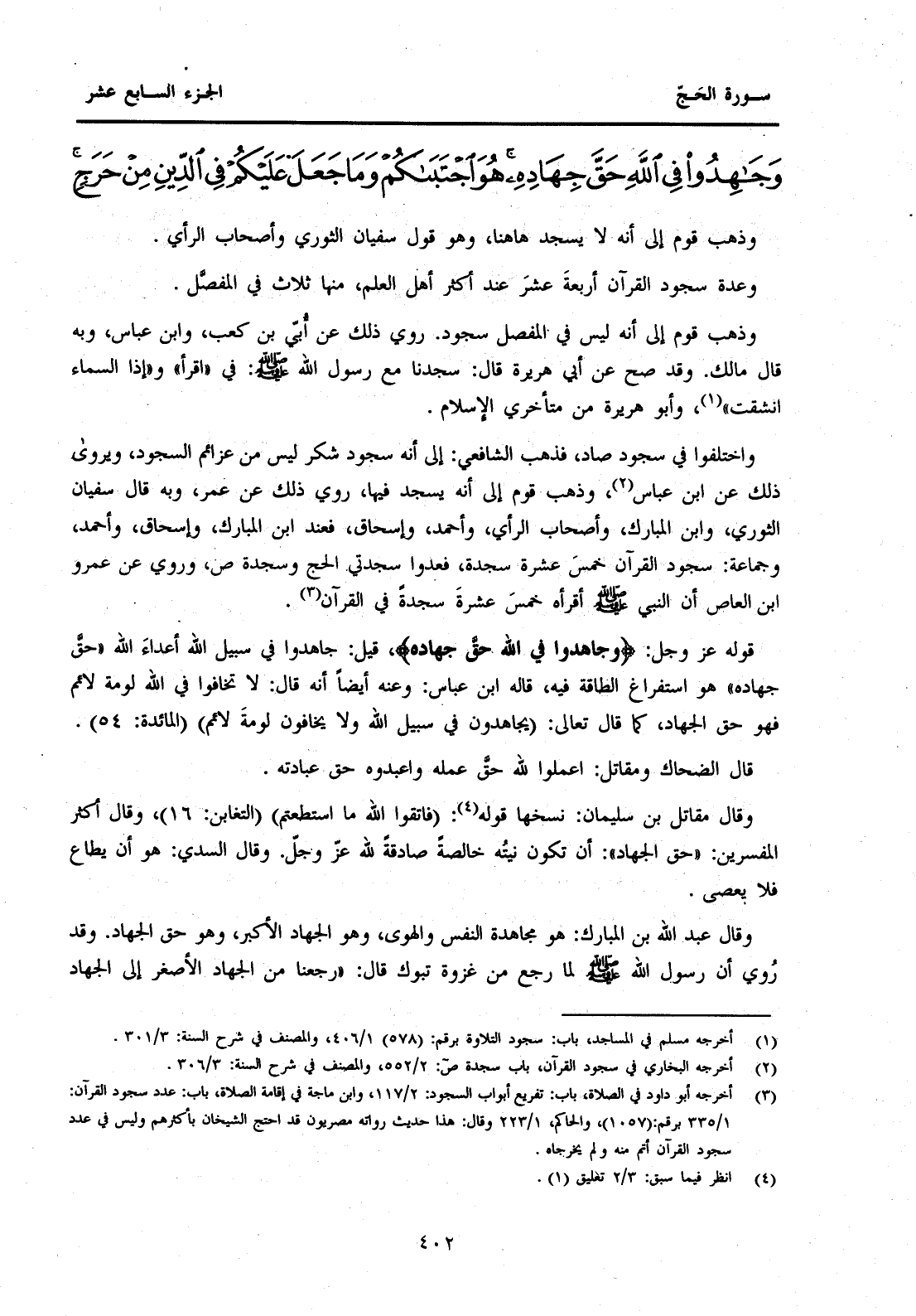 قَوْلُهُ عَزَّ وَجَلَّ: {وَجَاهِدُوا فِي اللَّهِ حَقَّ جِهَادِهِ} قِيلَ: جَاهِدُوا فِي سَبِيلِ اللَّهِ أَعْدَاءَ اللَّهِ "حَقَّ جِهَادِهِ" هُوَ اسْتِفْرَاغُ الطَّاقَةِ فِيهِ، قَالَهُ ابْنُ عَبَّاسٍ: وَعَنْهُ أَيْضًا أَنَّهُ قَالَ: لَا تَخَافُوا فِي اللَّهِ لَوْمَةَ لَائِمٍ فَهُوَ حَقُّ الْجِهَادِ، كَمَا قَالَ تَعَالَى: {يُجَاهِدُونَ فِي سَبِيلِ اللَّهِ وَلَا يَخَافُونَ لَوْمَةَ لَائِمٍ} (المَائِدَةِ: 54) .