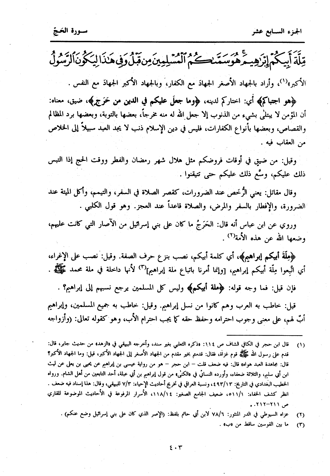 {مِلَّةَ أَبِيكُمْ إِبْرَاهِيمَ} أَيْ كَلِمَةَ أَبِيكُمْ، نُصِبَ بِنَزْعِ حَرْفِ الصِّفَةِ. وَقِيلَ: نُصِبَ عَلَى الْإِغْرَاءِ، أَيِ: اتَّبِعُوا مِلَّةَ أَبِيكُمْ إِبْرَاهِيمَ، [وَإِنَّمَا أَمَرَنَا بِاتِّبَاعِ مِلَّةِ إِبْرَاهِيمَ] (3) لِأَنَّهَا دَاخِلَةٌ فِي مِلَّةِ مُحَمَّدٍ صَلَّى اللَّهُ عَلَيْهِ وَسَلَّمَ.