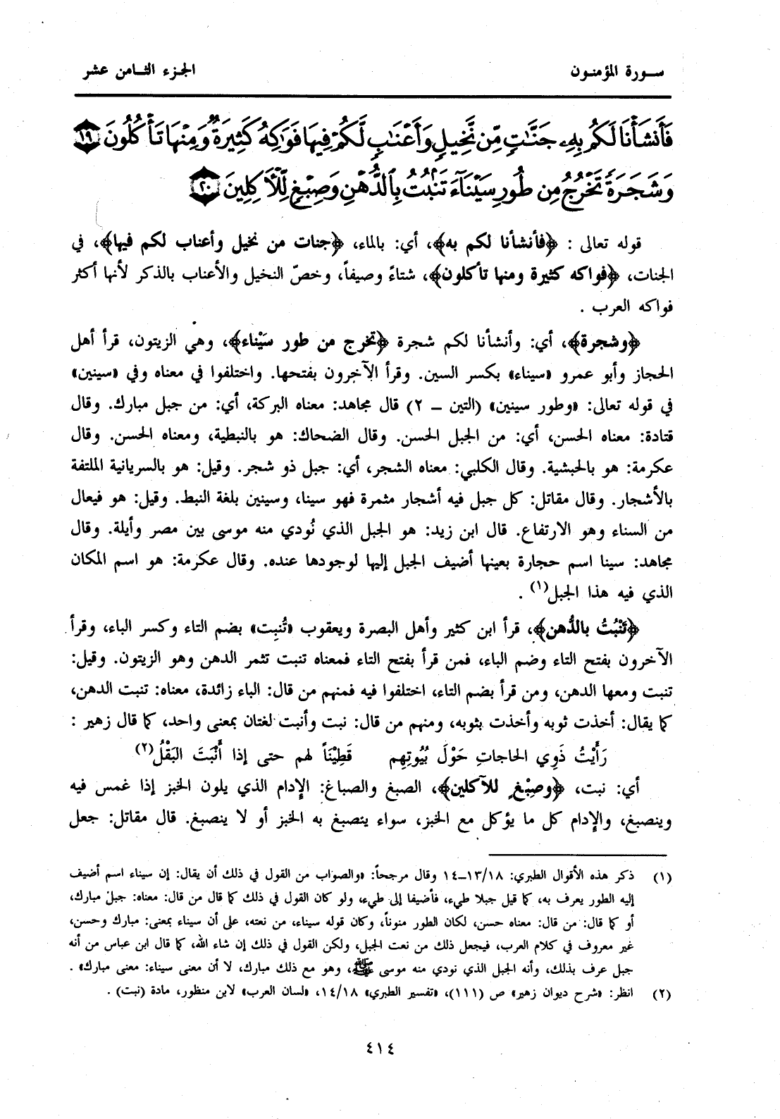 قَوْلُهُ تَعَالَى: {فَأَنْشَأْنَا لَكُمْ بِهِ} أَيْ: بِالْمَاءِ، {جَنَّاتٍ مِنْ نَخِيلٍ وَأَعْنَابٍ لَكُمْ فِيهَا} فِي الْجَنَّاتِ، {فَوَاكِهُ كَثِيرَةٌ وَمِنْهَا تَأْكُلُونَ} شِتَاءً وَصَيْفًا، وَخُصَّ النَّخِيلُ وَالْأَعْنَابُ بِالذِّكْرِ لِأَنَّهَا أَكْثَرُ فَوَاكِهِ الْعَرَبِ. {وَشَجَرَةً} أَيْ: وَأَنْشَأْنَا لَكُمْ شَجَرَةً {تَخْرُجُ مِنْ طُورِ سَيْنَاءَ} وَهِيَ الزَّيْتُونُ، قَرَأَ أَهْلُ الْحِجَازِ وَأَبُو عَمْرٍو "سِينَاءَ" بِكَسْرِ السِّينِ. وَقَرَأَ الْآخَرُونَ بِفَتْحِهَا وَاخْتَلَفُوا فِي مَعْنَاهُ وَفِي "سِينِينَ" فِي قَوْلِهِ تَعَالَى: "وَطُورِ سِينِينَ" (التَّينِ -2) قَالَ مُجَاهِدٌ: مَعْنَاهُ الْبَرَكَةُ، أَيْ: مِنْ جَبَلٍ مُبَارَكٍ. وَقَالَ قَتَادَةُ: مَعْنَاهُ الْحُسْنُ، أَيْ: مِنَ الْجَبَلِ الْحَسَنِ. وَقَالَ الضَّحَّاكُ: هُوَ بِالنَّبَطِيَّةِ، وَمَعْنَاهُ الْحُسْنُ. وَقَالَ عِكْرِمَةُ: هُوَ بِالْحَبَشِيَّةِ. وَقَالَ الْكَلْبِيُّ: مَعْنَاهُ الشَّجَرُ، أَيْ: جَبَلٌ ذُو شَجَرٍ. وَقِيلَ: هُوَ بِالسُّرْيَانِيَّةِ الْمُلْتَفَّةُ بِالْأَشْجَارِ. وَقَالَ مُقَاتِلٌ: كُلُّ جَبَلٍ فِيهِ أَشْجَارٌ مُثْمِرَةٌ فَهُوَ سِينًا، وَسِينِينَ بِلُغَةِ النَّبَطِ. وَقِيلَ: هُوَ فَيْعَالُ مِنَ السَّنَاءِ وَهُوَ الِارْتِفَاعُ. قَالَ ابْنُ زَيْدٍ: هُوَ الْجَبَلُ الَّذِي نُودِيَ مِنْهُ مُوسَى بَيْنَ مِصْرَ وَأَيْلَةَ. وَقَالَ مُجَاهِدٌ: سَيْنَا اسْمُ حِجَارَةٍ بِعَيْنِهَا أُضِيفَ الْجَبَلُ إِلَيْهَا لِوُجُودِهَا عِنْدَهُ. وَقَالَ عِكْرِمَةُ: هُوَ اسْمُ الْمَكَانِ الَّذِي فِيهِ هَذَا الْجَبَلُ (1) .