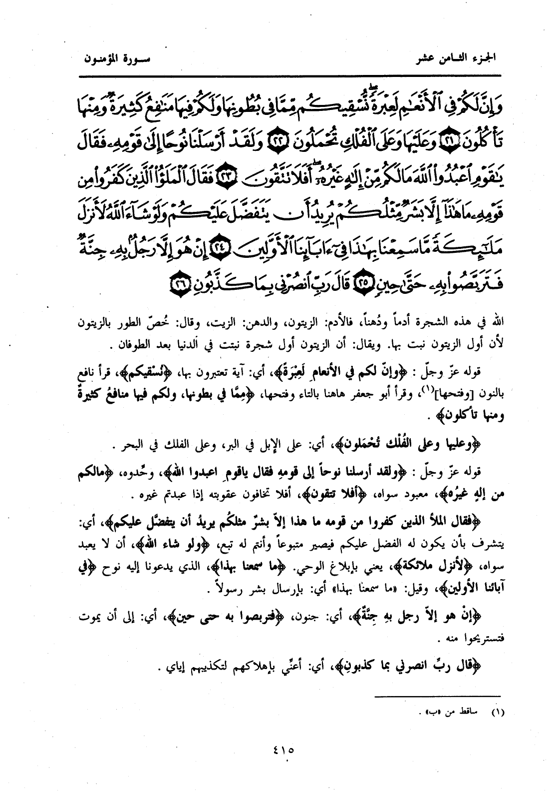 قَوْلُهُ عَزَّ وَجَلَّ: {وَإِنَّ لَكُمْ فِي الْأَنْعَامِ لَعِبْرَةً} أَيْ: آيَةً تَعْتَبِرُونَ بِهَا، {نُسْقِيكُمْ} قَرَأَ نَافِعٌ بِالنُّونِ [وَفَتْحِهَا] (1) وَقَرَأَ أَبُو جَعْفَرٍ هَاهُنَا بِالتَّاءِ وَفَتْحِهَا، {مِمَّا فِي بُطُونِهَا وَلَكُمْ فِيهَا مَنَافِعُ كَثِيرَةٌ وَمِنْهَا تَأْكُلُونَ} {وَعَلَيْهَا وَعَلَى الْفُلْكِ تُحْمَلُونَ} أَيْ: عَلَى الْإِبِلِ فِي الْبَرِّ، وَعَلَى الْفُلْكِ فِي الْبَحْرِ. قَوْلُهُ عَزَّ وَجَلَّ: {وَلَقَدْ أَرْسَلْنَا نُوحًا إِلَى قَوْمِهِ فَقَالَ يَا قَوْمِ اعْبُدُوا اللَّهَ} وَحِّدُوهُ، {مَا لَكُمْ مِنْ إِلَهٍ غَيْرُهُ} مَعْبُودٍ سِوَاهُ، {أَفَلَا تَتَّقُونَ} أَفَلَا تَخَافُونَ عُقُوبَتَهُ إِذَا عَبَدْتُمْ غَيْرَهُ. {فَقَالَ الْمَلَأُ الَّذِينَ كَفَرُوا مِنْ قَوْمِهِ مَا هَذَا إِلَّا بَشَرٌ مِثْلُكُمْ يُرِيدُ أَنْ يَتَفَضَّلَ عَلَيْكُمْ} أَيْ: يَتَشَرَّفَ بِأَنْ يَكُونَ لَهُ الْفَضْلُ عَلَيْكُمْ فَيَصِيرَ مَتْبُوعًا وَأَنْتُمْ لَهُ تَبَعٌ، {وَلَوْ شَاءَ اللَّهُ} أَنْ لَا يُعْبَدَ سِوَاهُ، {لَأَنْزَلَ مَلَائِكَةً} يَعْنِي بِإِبْلَاغِ الْوَحْيِ. {مَا سَمِعْنَا بِهَذَا} الَّذِي يَدْعُونَا إِلَيْهِ نُوحٌ {فِي آبَائِنَا الْأَوَّلِينَ} وَقِيلَ: "مَا سَمِعْنَا بِهَذَا" أَيْ: بِإِرْسَالِ بَشَرٍ رَسُولًا. {إِنْ هُوَ إِلَّا رَجُلٌ بِهِ جِنَّةٌ} أَيْ: جُنُونٌ، {فَتَرَبَّصُوا بِهِ حَتَّى حِينٍ} أَيْ: إِلَى أَنْ يَمُوتَ فَتَسْتَرِيحُوا مِنْهُ. {قَالَ رَبِّ انْصُرْنِي بِمَا كَذَّبُونِ} أَيْ: أَعِنِّي بِإِهْلَاكِهِمْ لِتَكْذِيبِهِمْ إِيَّايَ.