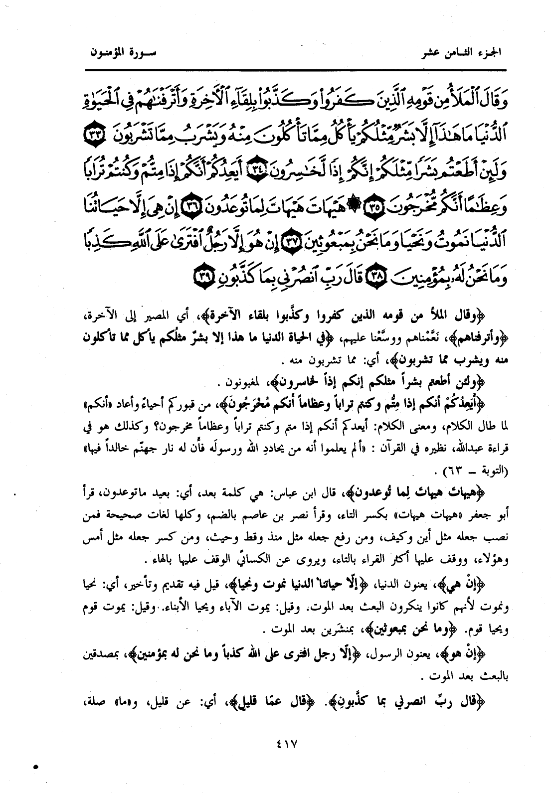 {وَقَالَ الْمَلَأُ مِنْ قَوْمِهِ الَّذِينَ كَفَرُوا وَكَذَّبُوا بِلِقَاءِ الْآخِرَةِ وَأَتْرَفْنَاهُمْ فِي الْحَيَاةِ الدُّنْيَا مَا هَذَا إِلَّا بَشَرٌ مِثْلُكُمْ يَأْكُلُ مِمَّا تَأْكُلُونَ مِنْهُ وَيَشْرَبُ مِمَّا تَشْرَبُونَ (33) وَلَئِنْ أَطَعْتُمْ بَشَرًا مِثْلَكُمْ إِنَّكُمْ إِذًا لَخَاسِرُونَ (34) أَيَعِدُكُمْ أَنَّكُمْ إِذَا مِتُّمْ وَكُنْتُمْ تُرَابًا وَعِظَامًا أَنَّكُمْ مُخْرَجُونَ (35) هَيْهَاتَ هَيْهَاتَ لِمَا تُوعَدُونَ (36) إِنْ هِيَ إِلَّا حَيَاتُنَا الدُّنْيَا نَمُوتُ وَنَحْيَا وَمَا نَحْنُ بِمَبْعُوثِينَ (37) إِنْ هُوَ إِلَّا رَجُلٌ افْتَرَى عَلَى اللَّهِ كَذِبًا وَمَا نَحْنُ لَهُ بِمُؤْمِنِينَ (38) قَالَ رَبِّ انْصُرْنِي بِمَا كَذَّبُونِ (39) }