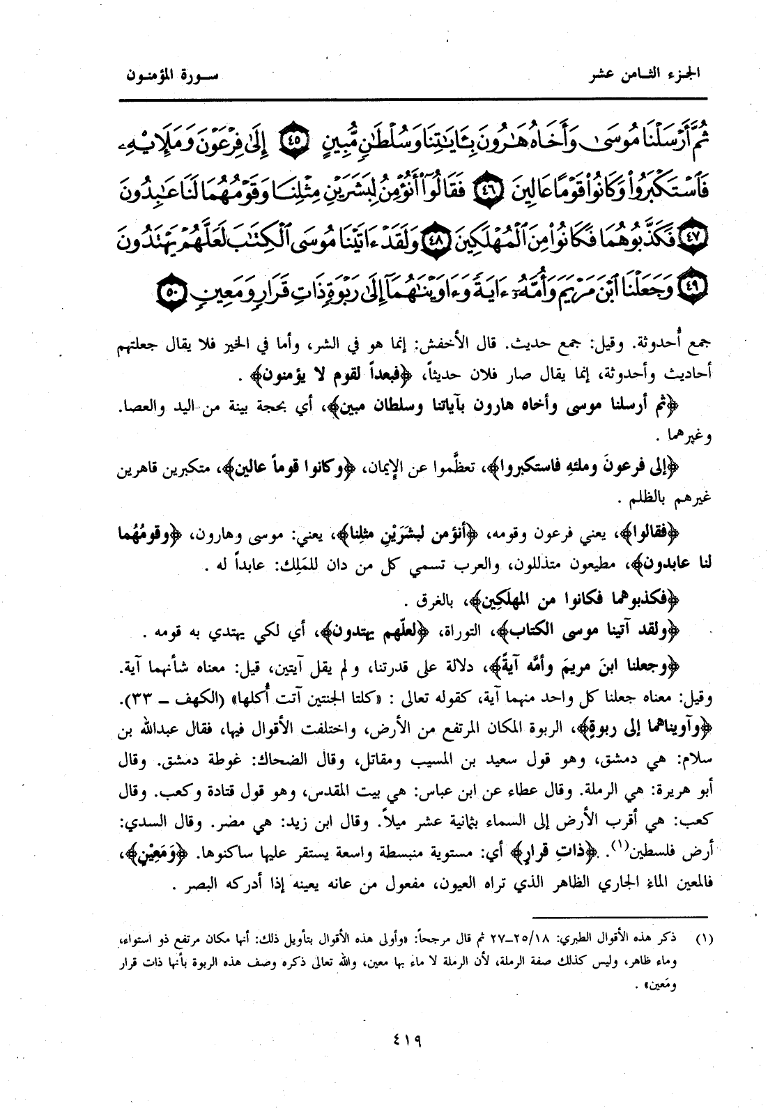 {ثُمَّ أَرْسَلْنَا مُوسَى وَأَخَاهُ هَارُونَ بِآيَاتِنَا وَسُلْطَانٍ مُبِينٍ} أَيْ بِحُجَّةٍ بَيِّنَةٍ مِنَ الْيَدِ وَالْعَصَا. وَغَيْرِهِمَا. {إِلَى فِرْعَوْنَ وَمَلَئِهِ فَاسْتَكْبَرُوا} تَعَظَّمُوا عَنِ الْإِيمَانِ، {وَكَانُوا قَوْمًا عَالِينَ} مُتَكَبِّرِينَ قَاهِرِينَ غَيْرَهُمْ بِالظُّلْمِ. {فَقَالُوا} يَعْنِي فِرْعَوْنَ وَقَوْمَهُ، {أَنُؤْمِنُ لِبَشَرَيْنِ مِثْلِنَا} يَعْنِي: مُوسَى وَهَارُونَ، {وَقَوْمُهُمَا لَنَا عَابِدُونَ} مُطِيعُونَ مُتَذَلِّلُونَ، وَالْعَرَبُ تُسَمِّي كُلَّ مَنْ دَانَ لِلْمَلِكِ: عَابِدًا لَهُ. {فَكَذَّبُوهُمَا فَكَانُوا مِنَ الْمُهْلَكِينَ} بِالْغَرَقِ. {وَلَقَدْ آتَيْنَا مُوسَى الْكِتَابَ} التَّوْرَاةَ، {لَعَلَّهُمْ يَهْتَدُونَ} أَيْ لِكَيْ يَهْتَدِيَ بِهِ قَوْمُهُ. {وَجَعَلْنَا ابْنَ مَرْيَمَ وَأُمَّهُ آيَةً} دَلَالَةً عَلَى قُدْرَتِنَا، وَلَمْ يَقُلْ آيَتَيْنِ، قِيلَ: مَعْنَاهُ شَأْنُهُمَا آيَةٌ. وَقِيلَ: مَعْنَاهُ جَعَلْنَا كُلَّ وَاحِدٍ مِنْهُمَا آيَةً، كَقَوْلِهِ تَعَالَى: "كِلْتَا الْجَنَّتَيْنِ آتَتْ أُكُلَهَا" (الكَهْفِ -33) . {وَآوَيْنَاهُمَا إِلَى رَبْوَةٍ} الرَّبْوَةُ الْمَكَانُ الْمُرْتَفِعُ مِنَ الْأَرْضِ، وَاخْتَلَفَتِ الْأَقْوَالُ فِيهَا، فَقَالَ عَبْدُ اللَّهِ بْنُ سَلَامٍ: هِيَ دِمَشْقٌ، وَهُوَ قَوْلُ سَعِيدِ بْنِ الْمُسَيَّبِ وَمُقَاتِلٍ، وَقَالَ الضَّحَّاكُ: غُوطَةُ دِمَشْقَ. وَقَالَ أَبُو هُرَيْرَةَ: هِيَ الرَّمَلَةُ. وَقَالَ عَطَاءٌ عَنِ ابْنِ عَبَّاسٍ: هِيَ بَيْتُ الْمَقْدِسِ، وَهُوَ قَوْلُ قَتَادَةَ وَكَعْبٍ. وَقَالَ كَعْبٌ: هِيَ أَقْرَبُ الْأَرْضِ إِلَى السَّمَاءِ بِثَمَانِيَةَ عَشَرَ مِيلًا. وَقَالَ ابْنُ زَيْدٍ: هِيَ مِصْرُ. وَقَالَ السُّدِّيُّ: أَرْضُ فِلَسْطِينَ (1) . {ذَاتِ قَرَارٍ} أَيْ: مُسْتَوِيَةٍ مُنْبَسِطَةٍ وَاسِعَةٍ يَسْتَقِرُّ عَلَيْهَا سَاكِنُوهَا. {وَمَعِينٍ} فَالْمَعِينُ الْمَاءُ الْجَارِي الظَّاهِرُ الَّذِي تَرَاهُ الْعُيُونُ، مَفْعُولٌ مَنْ عَانَهُ يُعِينُهُ إِذَا أَدْرَكَهُ الْبَصَرُ.