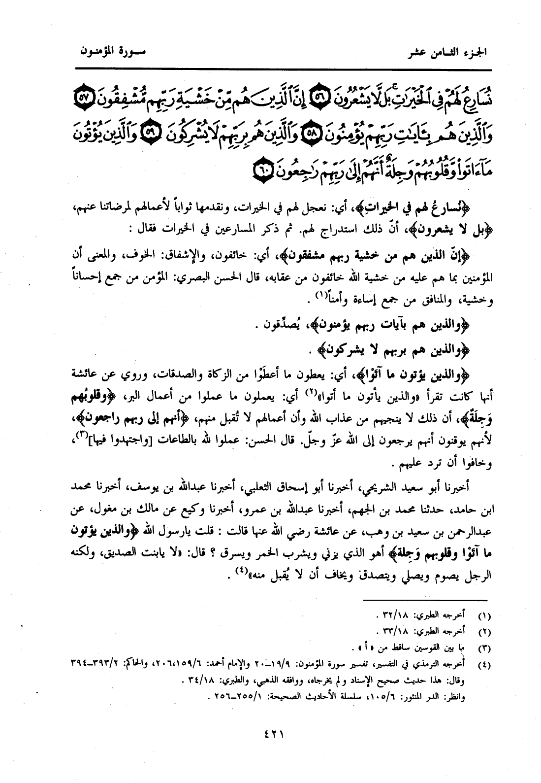 (4) أخرجه الترمذي في التفسير، تفسير سورة المؤمنون: 9 / 19 - 20 والإمام أحمد: 6 / 159، 206، والحاكم: 2 / 393 - 394 وقال: هذا حديث صحيح الإسناد ولم يخرجاه، ووافقه الذهبي، والطبري: 18 / 34. وانظر: الدر المنثور: 6 / 105، سلسلة الأحاديث الصحيحة: 1 / 255 - 256.