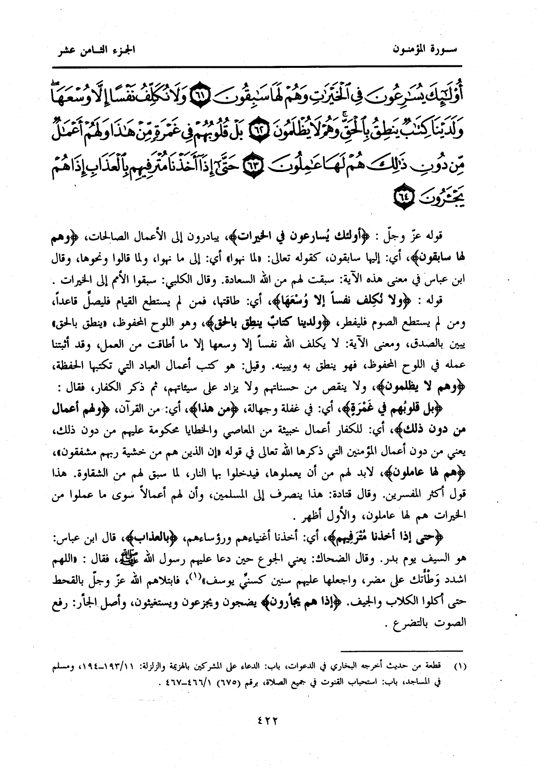 قَوْلُهُ عَزَّ وَجَلَّ: {أُولَئِكَ يُسَارِعُونَ فِي الْخَيْرَاتِ} يُبَادِرُونَ إِلَى الْأَعْمَالِ الصَّالِحَاتِ، {وَهُمْ لَهَا سَابِقُونَ} أَيْ: إِلَيْهَا سَابِقُونَ، كَقَوْلِهِ تَعَالَى: "لِمَا نُهُوا" أَيْ: إِلَى مَا نُهُوا، وَلِمَا قَالُوا وَنَحْوِهَا، وَقَالَ ابْنُ عَبَّاسٍ فِي مَعْنَى هَذِهِ الْآيَةِ: سَبَقَتْ لَهُمْ مِنَ اللَّهِ السَّعَادَةُ. وَقَالَ الْكَلْبِيُّ: سَبَقُوا الْأُمَمَ إِلَى الْخَيْرَاتِ. قَوْلُهُ: {وَلَا نُكَلِّفُ نَفْسًا إِلَّا وُسْعَهَا} أَيْ: طَاقَتَهَا، فَمَنْ لَمْ يَسْتَطِعِ الْقِيَامَ فَلْيُصَلِّ قَاعِدًا، وَمَنْ لَمْ يَسْتَطِعِ الصَّوْمَ فَلْيُفْطِرْ، {وَلَدَيْنَا كِتَابٌ يَنْطِقُ بِالْحَقِّ} وَهُوَ اللَّوْحُ الْمَحْفُوظُ، "يَنْطِقُ بِالْحَقِّ" يُبَيِّنُ بِالصِّدْقِ، وَمَعْنَى الْآيَةِ: لَا يُكَلِّفُ اللَّهُ نَفْسًا إِلَّا وُسْعَهَا إِلَّا مَا أَطَاقَتْ مِنَ الْعَمَلِ، وَقَدْ أَثْبَتْنَا عَمَلَهُ فِي اللَّوْحِ الْمَحْفُوظِ، فَهُوَ يَنْطِقُ بِهِ وَيُبَيِّنُهُ. وَقِيلَ: هُوَ كَتْبُ أَعْمَالِ الْعِبَادِ الَّتِي تَكْتُبُهَا الْحَفَظَةُ، {وَهُمْ لَا يُظْلَمُونَ} وَلَا يُنْقَصُ مِنْ حَسَنَاتِهِمْ وَلَا يُزَادُ عَلَى سَيِّئَاتِهِمْ. ثُمَّ ذَكَرَ الْكُفَّارَ، فَقَالَ: {بَلْ قُلُوبُهُمْ فِي غَمْرَةٍ} أَيْ: فِي غَفْلَةٍ وَجَهَالَةٍ، {مِنْ هَذَا} أَيْ: مِنَ الْقُرْآنِ، {وَلَهُمْ أَعْمَالٌ مِنْ دُونِ ذَلِكَ} أَيْ: لِلْكُفَّارِ أَعْمَالٌ خَبِيثَةٌ مِنَ الْمَعَاصِي وَالْخَطَايَا مَحْكُومَةٌ عَلَيْهِمْ مِنْ دُونِ ذَلِكَ، يَعْنِي مِنْ دُونِ أَعْمَالِ الْمُؤْمِنِينَ الَّتِي ذَكَرَهَا اللَّهُ تَعَالَى فِي قَوْلِهِ "إِنَّ الَّذِينَ هُمْ مِنْ خَشْيَةِ رَبِّهِمْ مُشْفِقُونَ"، {هُمْ لَهَا عَامِلُونَ} لَا بُدَّ لَهُمْ مِنْ أَنْ يَعْمَلُوهَا، فَيَدْخُلُوا بِهَا النَّارَ، لِمَا سَبَقَ لَهُمْ مِنَ الشَّقَاوَةِ. هَذَا قَوْلُ أَكْثَرِ الْمُفَسِّرِينَ. وَقَالَ قَتَادَةُ: هَذَا يَنْصَرِفُ إِلَى الْمُسْلِمِينَ، وَأَنَّ لَهُمْ أَعْمَالًا سِوَى مَا عَمِلُوا مِنَ الْخَيْرَاتِ هُمْ لَهَا عَامِلُونَ، وَالْأَوَّلُ أَظْهَرُ. {حَتَّى إِذَا أَخَذْنَا مُتْرَفِيهِمْ} أَيْ: أَخَذْنَا أَغْنِيَاءَهُمْ وَرُؤَسَاءَهُمْ، {بِالْعَذَابِ} قَالَ ابْنُ عَبَّاسٍ: هُوَ السَّيْفُ يَوْمَ بَدْرٍ. وَقَالَ الضَّحَّاكُ: يَعْنِي الْجُوعَ حِينَ دَعَا عَلَيْهِمْ رَسُولُ اللَّهِ صَلَّى اللَّهُ عَلَيْهِ وَسَلَّمَ فَقَالَ: "اللَّهُمَّ اشْدُدْ وَطَأَتَكَ عَلَى مُضَرَ، وَاجْعَلْهَا عَلَيْهِمْ سِنِينَ كَسِنِّيِّ يُوسُفَ" (1) فَابْتَلَاهُمُ اللَّهُ عَزَّ وَجَلَّ بِالْقَحْطِ حَتَّى أَكَلُوا الْكِلَابَ وَالْجِيَفَ. {إِذَا هُمْ يَجْأَرُونَ} يَضِجُّونَ وَيَجْزَعُونَ وَيَسْتَغِيثُونَ، وَأَصْلُ الْجَأْرِ: رَفَعُ الصَّوْتِ بِالتَّضَرُّعِ.